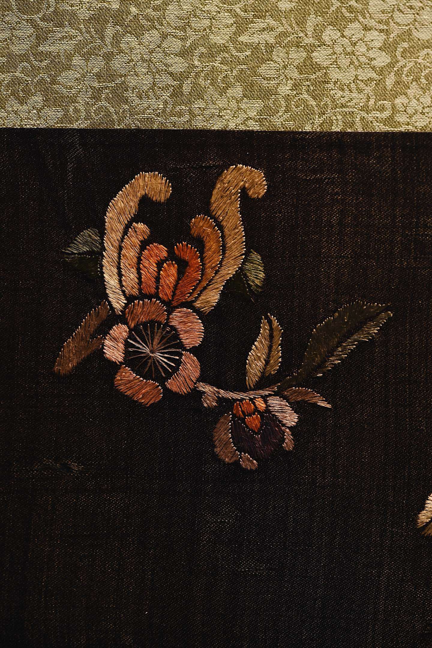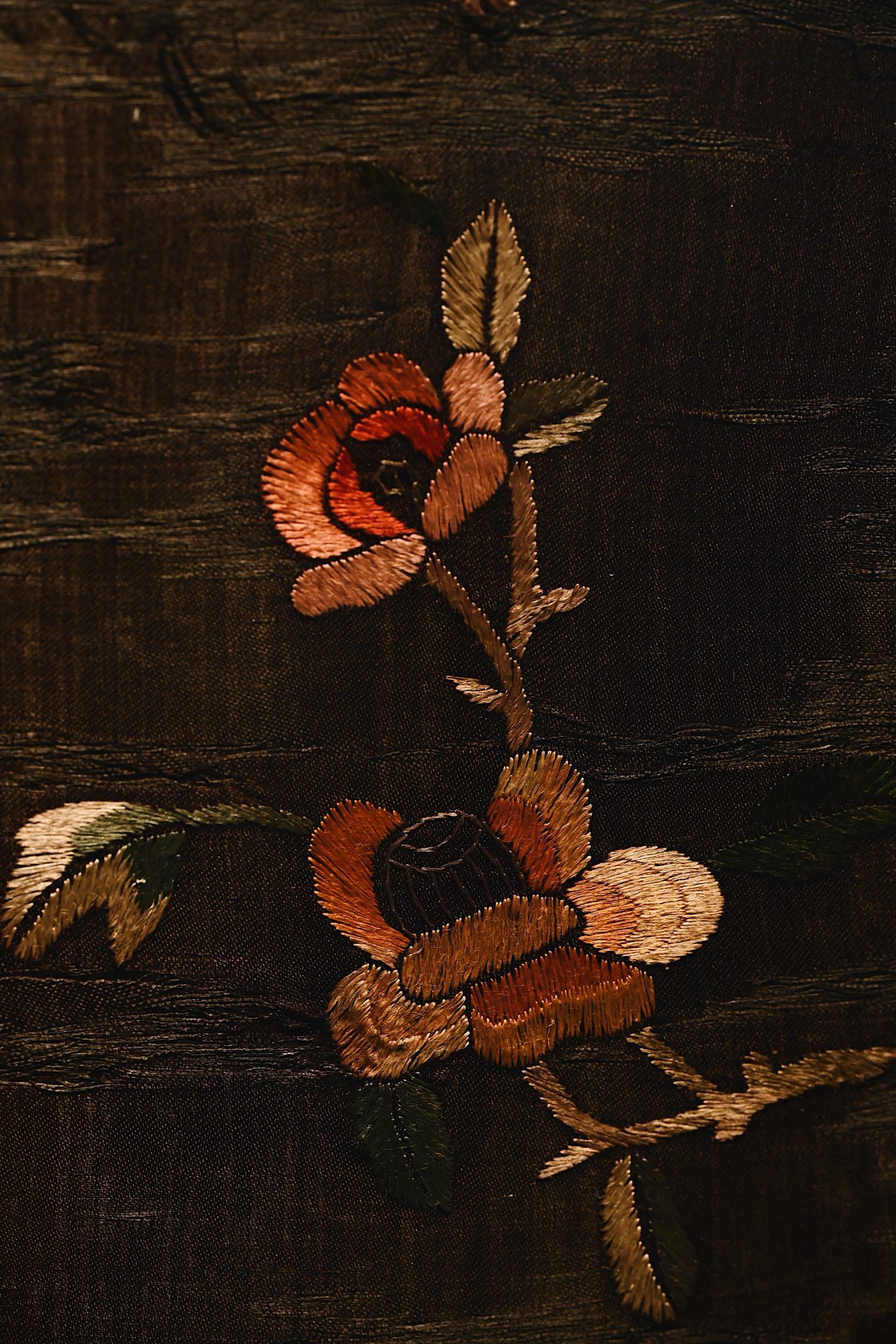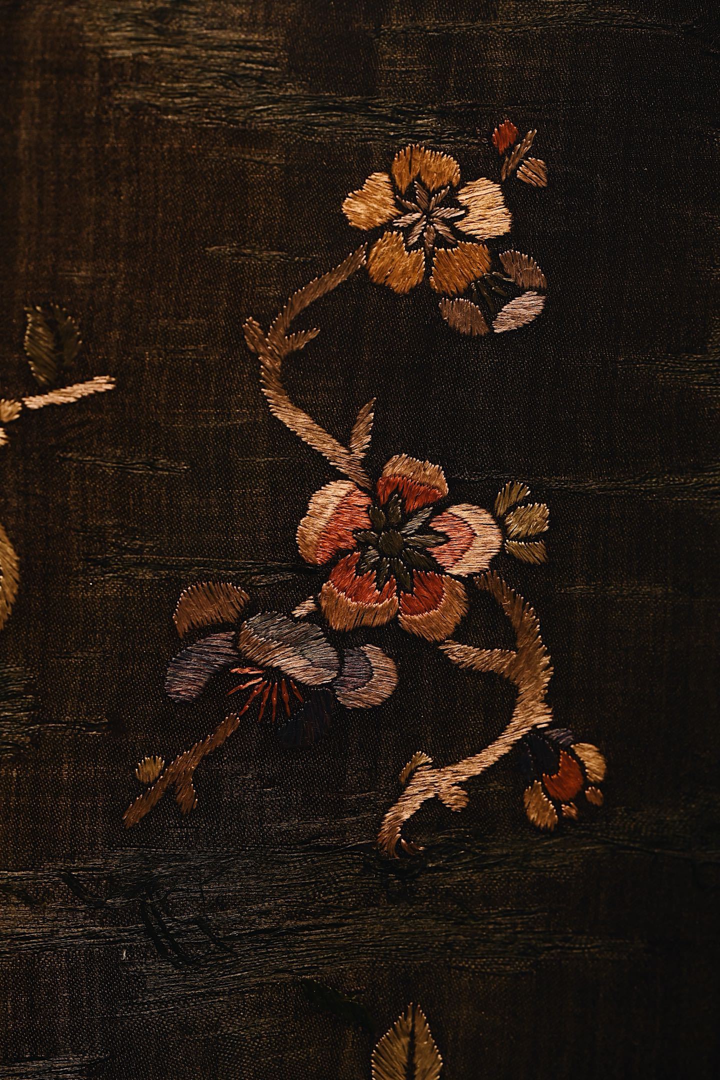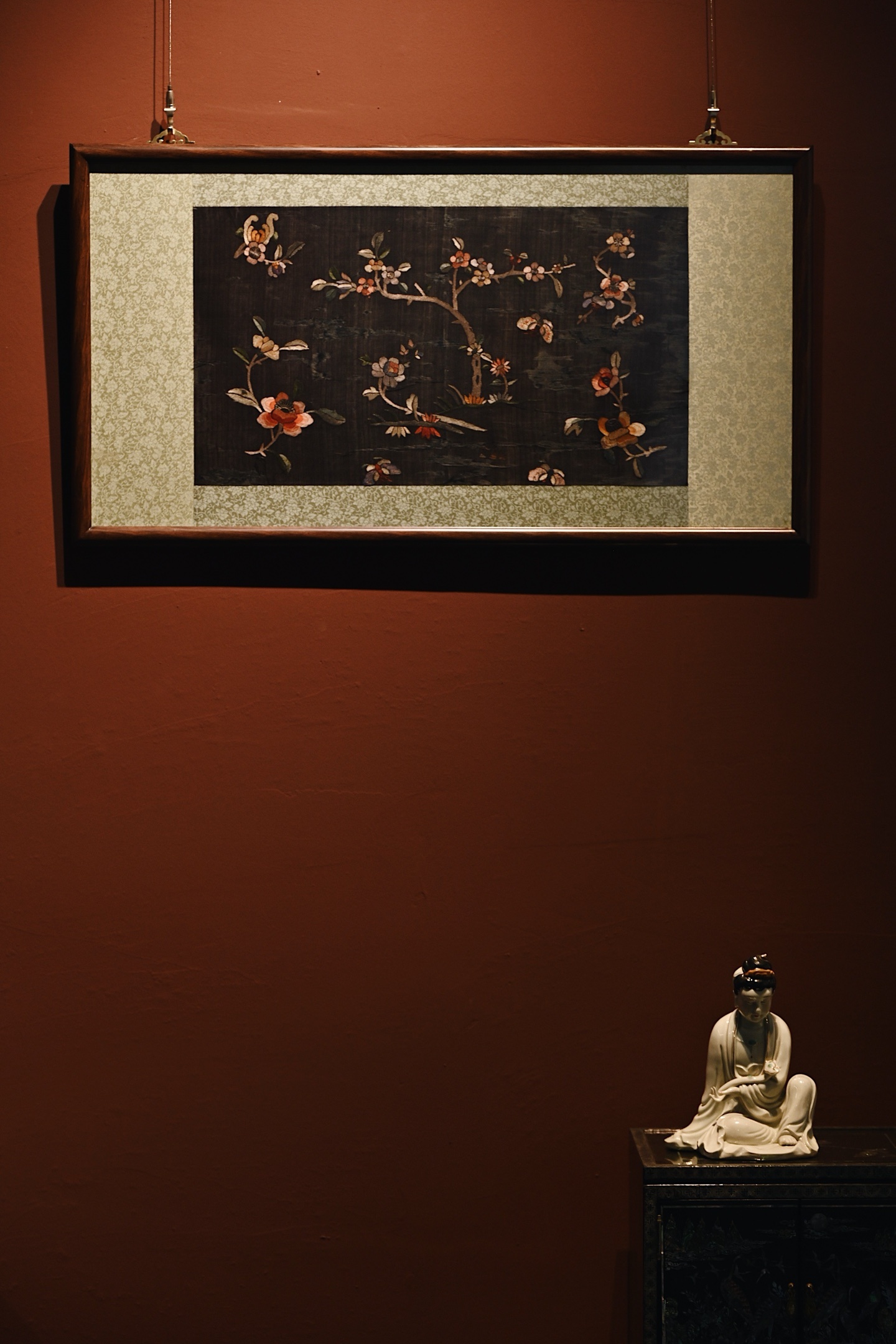 大致为民国之物,保存较为完整,色泽沉穆,取“清供”之意,绣“富贵”之花。画面构图疏朗,红梅迎春,山茶纳福,彩蝶飞舞,饱含吉祥寓意。悬挂于室,承载着东方生活的雅致情怀。