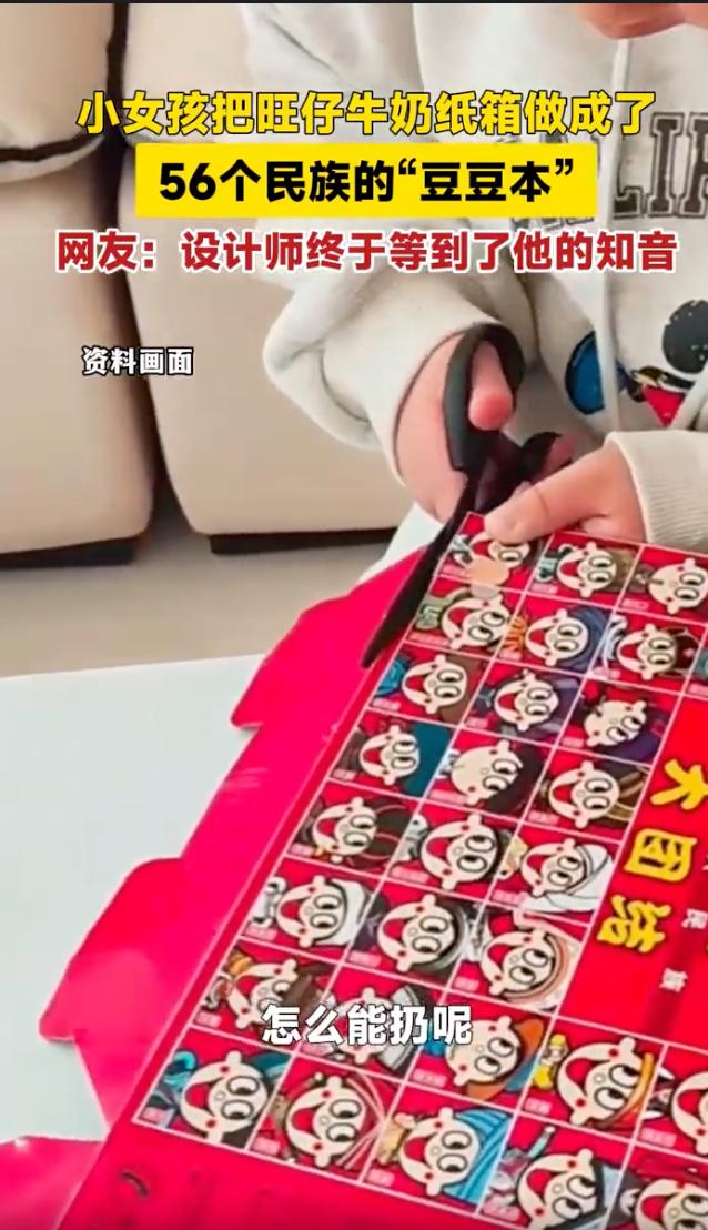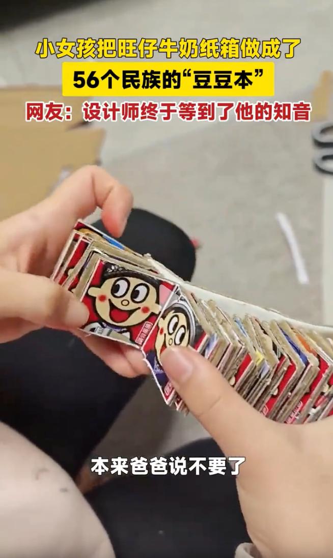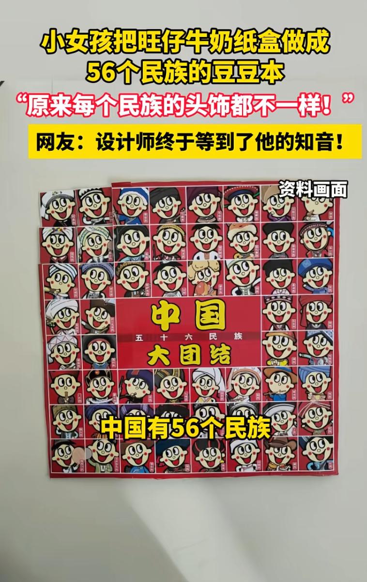 真是祖国的未来啊!河北沧州,一名8岁的小女孩史同学彻底火了,她把爸爸准备扔掉的废纸盒捡回来,硬是抠出了一本56个民族豆豆本,网友直呼:这哪是剪纸,这是给全网大人上了一堂生动的民族文化课。 当天,史同学的爸爸正打算把家里积攒的旺仔牛奶空箱子清理掉,还在箱子上特意贴了个明天丢掉的纸条,打算第二天当垃圾处理了,没成想却被眼尖的史同学给拦了下来。 她蹲在地上跟爸爸据理力争,说这么漂亮的东西怎么能当废品扔了,随后就自己拿着小剪刀趴在桌子前忙活了一整晚,她把纸盒侧面那些五颜六色的民族娃娃图案一个个剪开,精准地把发饰、服饰、头饰这些细节全给抠了下来。 这8岁的小姑娘不仅把56个民族的娃娃全集齐了,还认认真真地把这些小卡片装订成册,封面上端端正正手写下中国两个大字,翻开一看,从苗族的银饰到蒙族的袍子清清楚楚,甚至连平时不常见的民族生僻字都认全了。 这份极具巧思的作品被带到学校后,立刻引起了全班的轰动,老师如获至宝,直接拿在班级里进行公开展示,全校师生都竖大拇指。 更让人惊喜的是,这事儿竟然传到了旺仔官方设计师的耳朵里,设计师看完当场感慨万千,直言这个隐藏在包装上长达20年的小心思,终于被这个8岁的知音发现了。 目前这事已经冲上热搜,网友都被这娃的灵性给折服了 有人说这种引导性的教育太关键了,妈妈没嫌孩子折腾,反而耐心地听她介绍,给足了情绪价值,才没让这颗好苗子被生活的琐碎给埋没掉。 也有网友感慨,咱们喝了这么多年的奶,都没发现这包装盒上的彩蛋,这孩子长大了必有大出息,定力和文化敏感度简直是满格。 看完史同学的豆豆本,心里头真的是又惊艳又感慨,一个二年级的孩子,愣是从一堆废纸盒里抠出了民族大团结的文化瑰宝,这种钻研劲头真让不少大人汗颜。 这种对美好事物的捕捉力绝不是刷几道题就能换来的,它是藏在孩子骨子里那份纯粹的好奇心,更是对中国文化最直观的认同与热爱。 这种美好的事物不该被丢进垃圾桶,更不该被试卷堆给埋没,只有保持这份好奇心,往后的日子才能活出不一样的色彩。 咱们当家长的真的该好好反思,到底是给孩子报满各种特长班重要,还是保护好他们这点天马行空的创造力重要,毕竟文化自信就在这一剪一贴的指尖里。