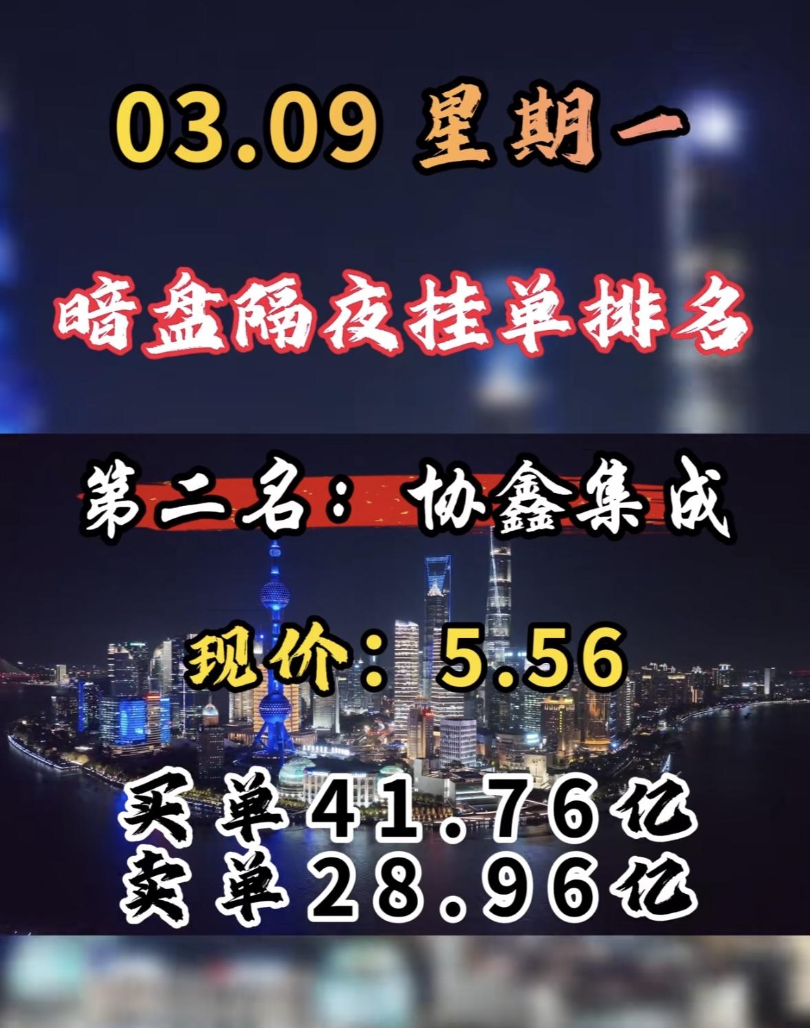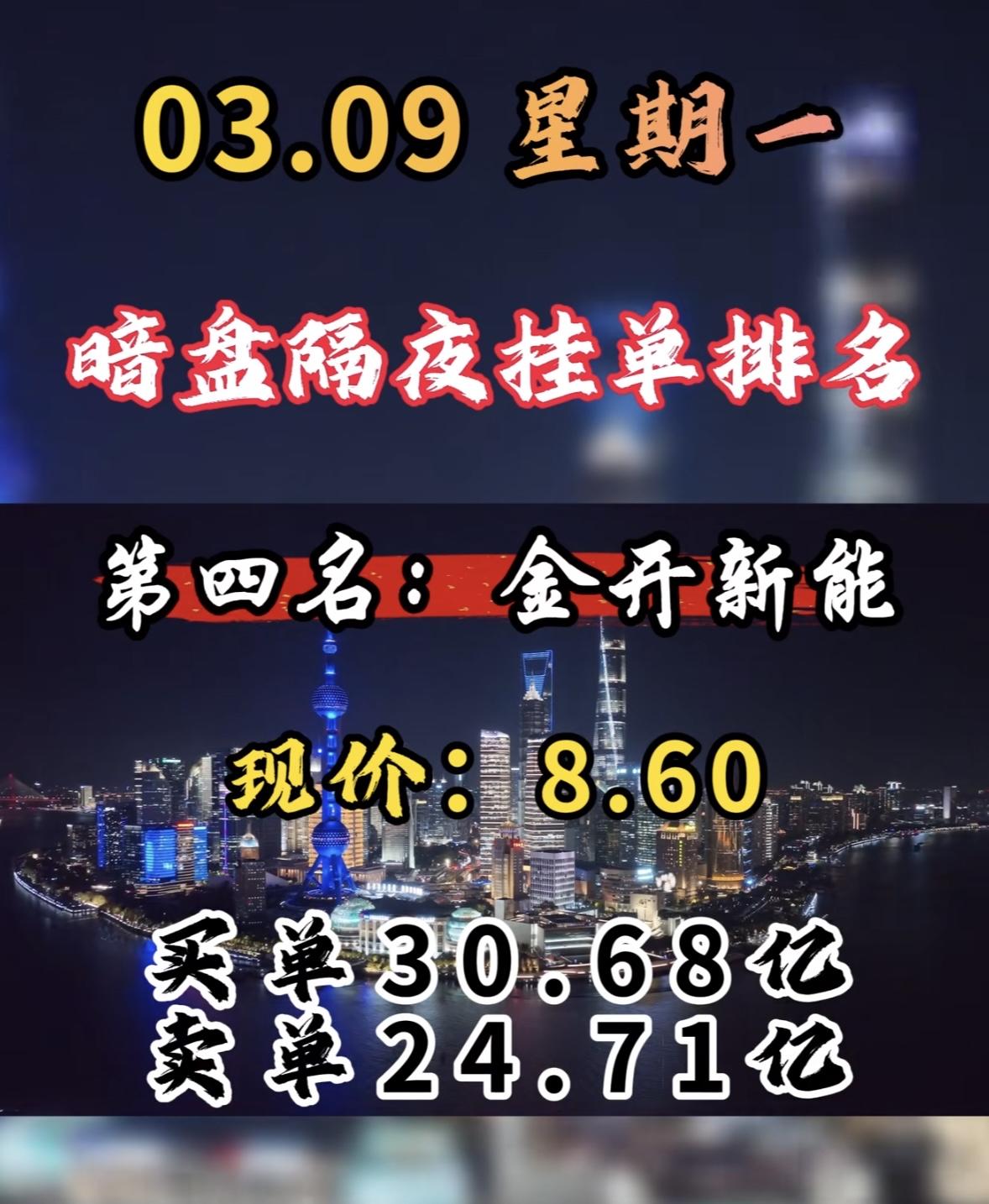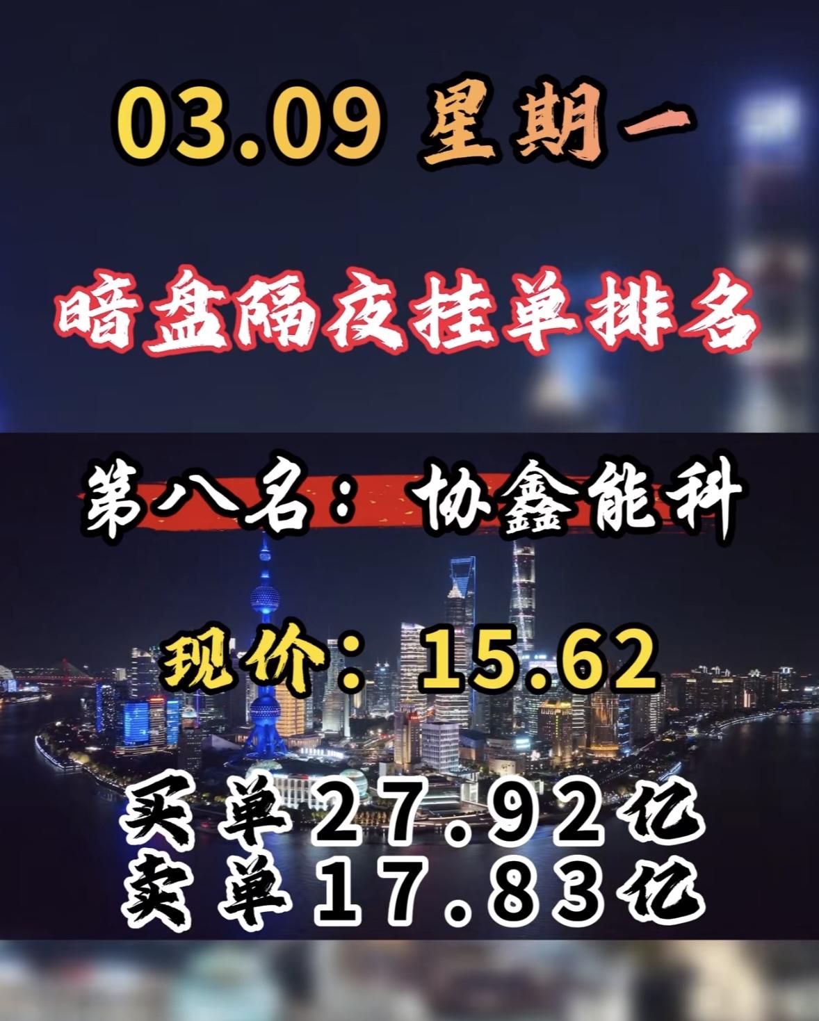 3月9日周一暗盘隔夜挂单前8名个股揭晓。 协鑫能科排第八,不过它在暗盘表现超亮眼,成了榜首。它现价15.62元,买单27.92亿,卖单17.83亿。 在A股市场,电力板块当天表现活跃,协鑫能科更是以缩量涨停成焦点。它收盘报15.62元,涨幅10%,成交额15.05亿元。从分时图看,早盘高开后稳步上升,午后买盘增强封死涨停。这缩量涨停展现出强劲上涨动能。周二它会怎样呢?很让人期待,咱们就等着瞧!