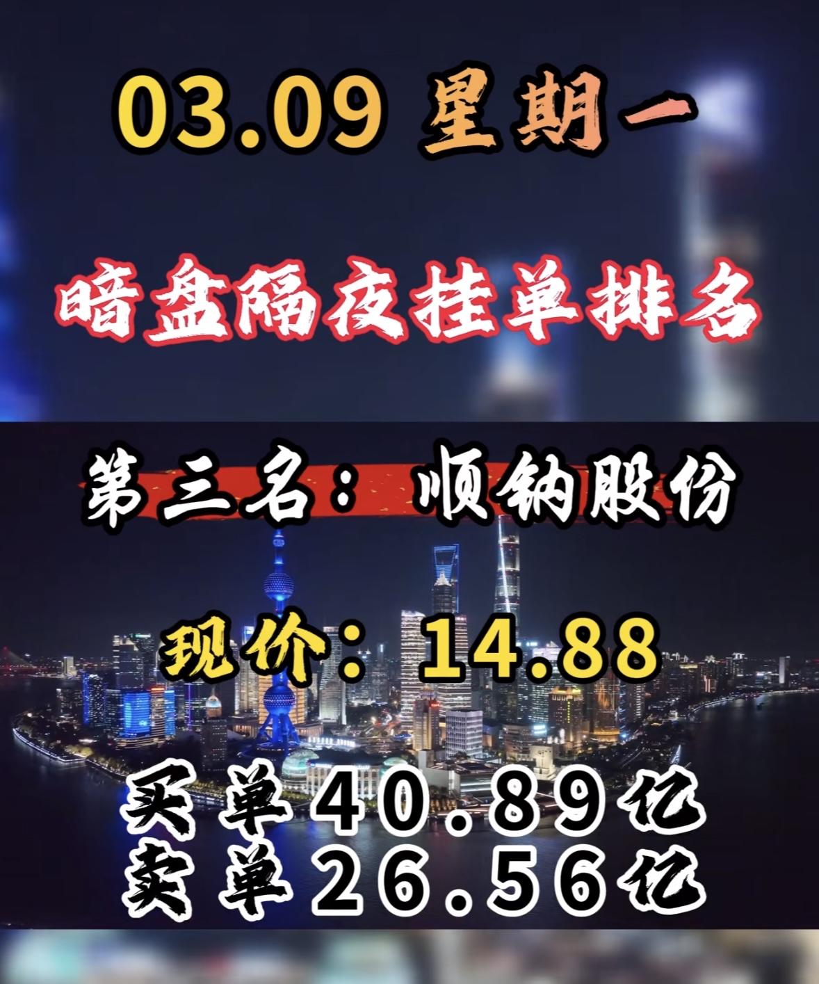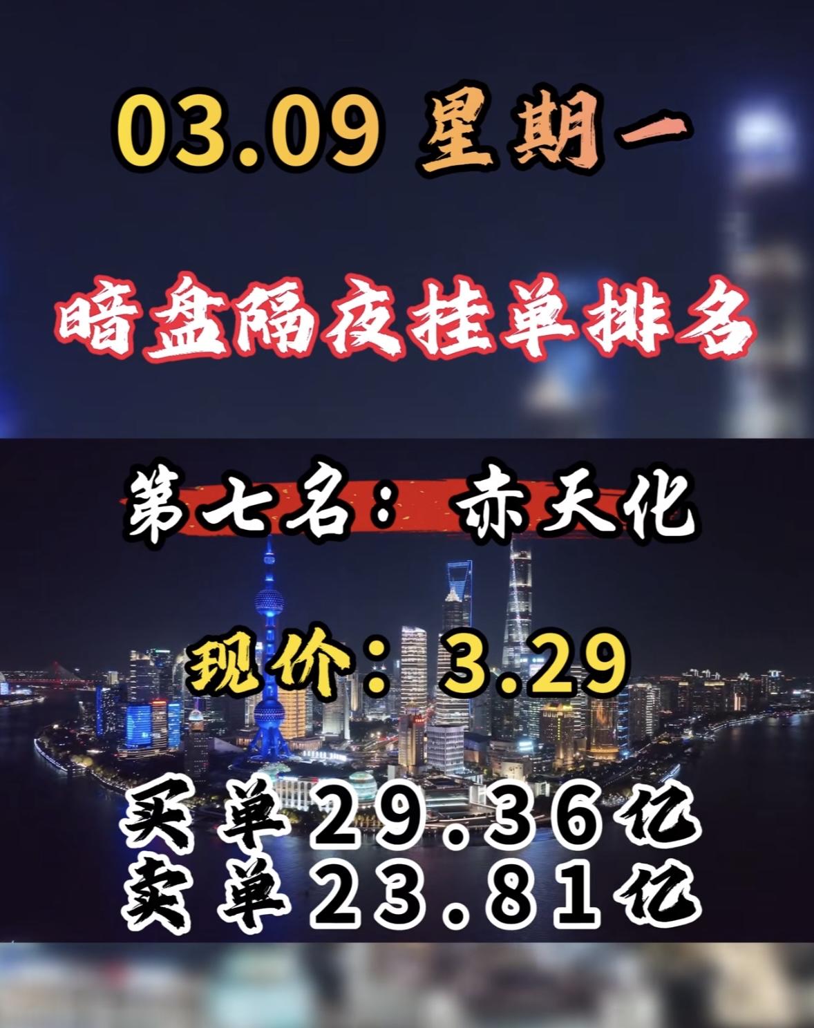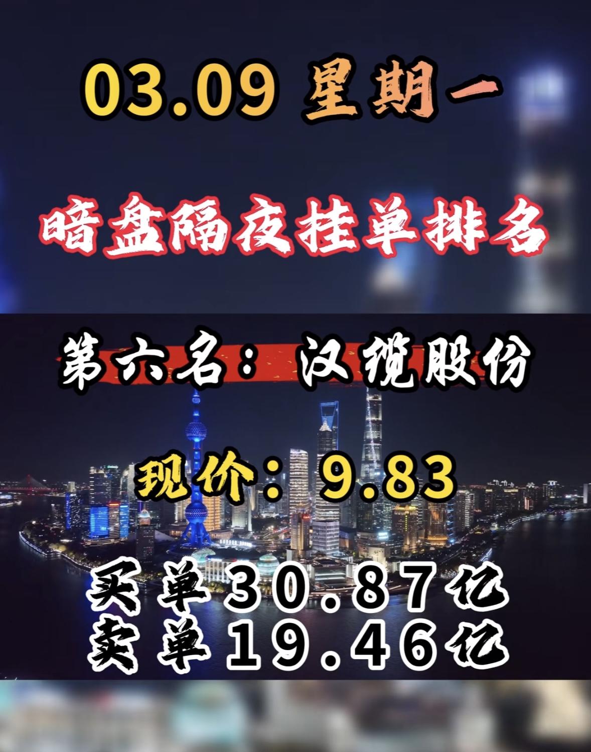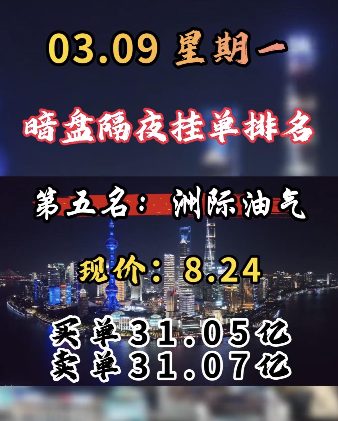 3月9日周一暗盘隔夜挂单前8名个股揭晓。 协鑫能科排第八,不过它在暗盘表现超亮眼,成了榜首。它现价15.62元,买单27.92亿,卖单17.83亿。 在A股市场,电力板块当天表现活跃,协鑫能科更是以缩量涨停成焦点。它收盘报15.62元,涨幅10%,成交额15.05亿元。从分时图看,早盘高开后稳步上升,午后买盘增强封死涨停。这缩量涨停展现出强劲上涨动能。周二它会怎样呢?很让人期待,咱们就等着瞧!