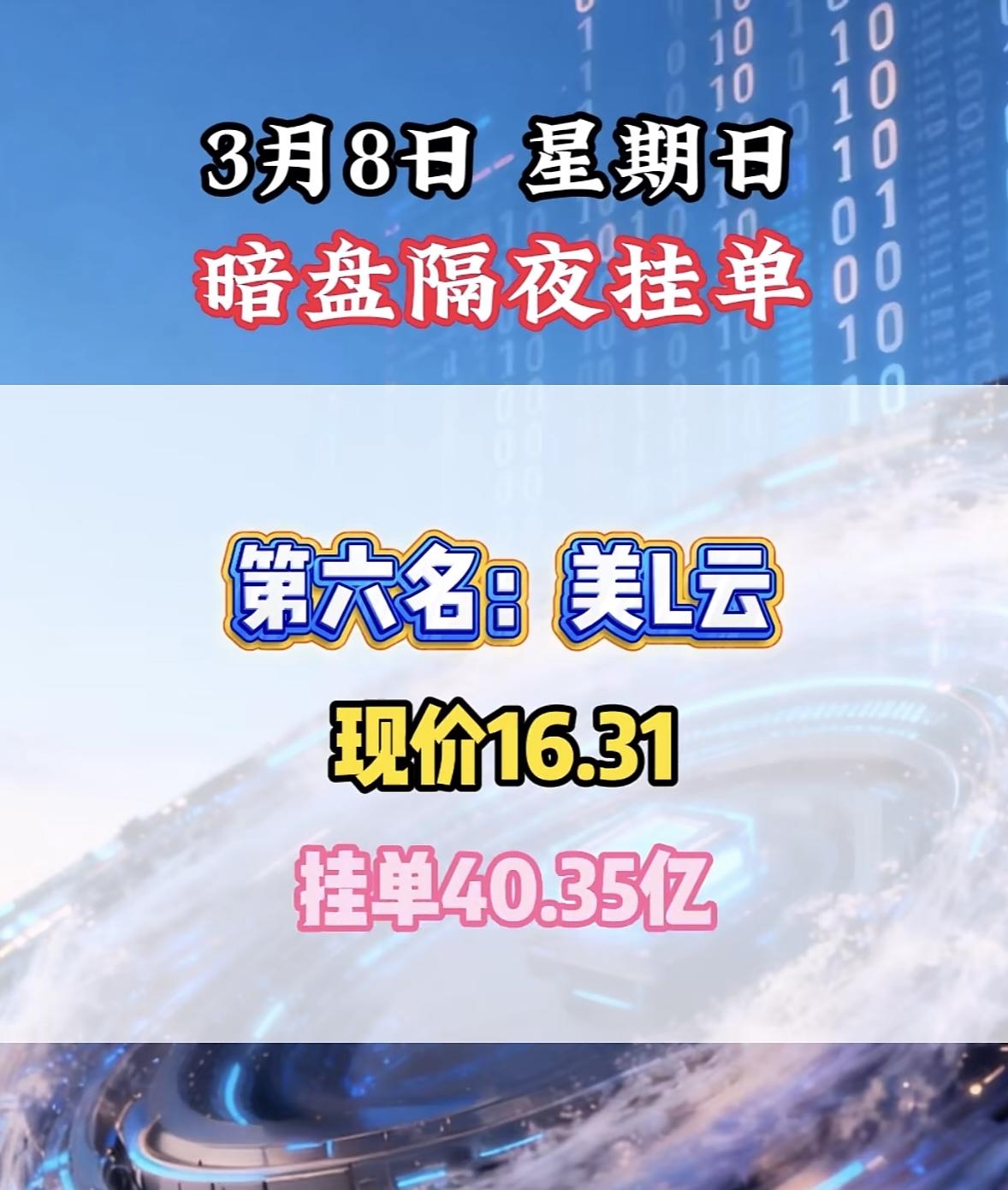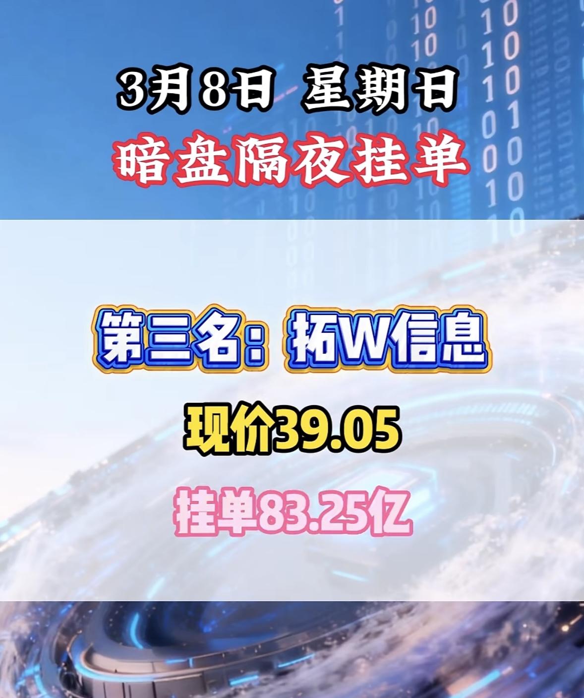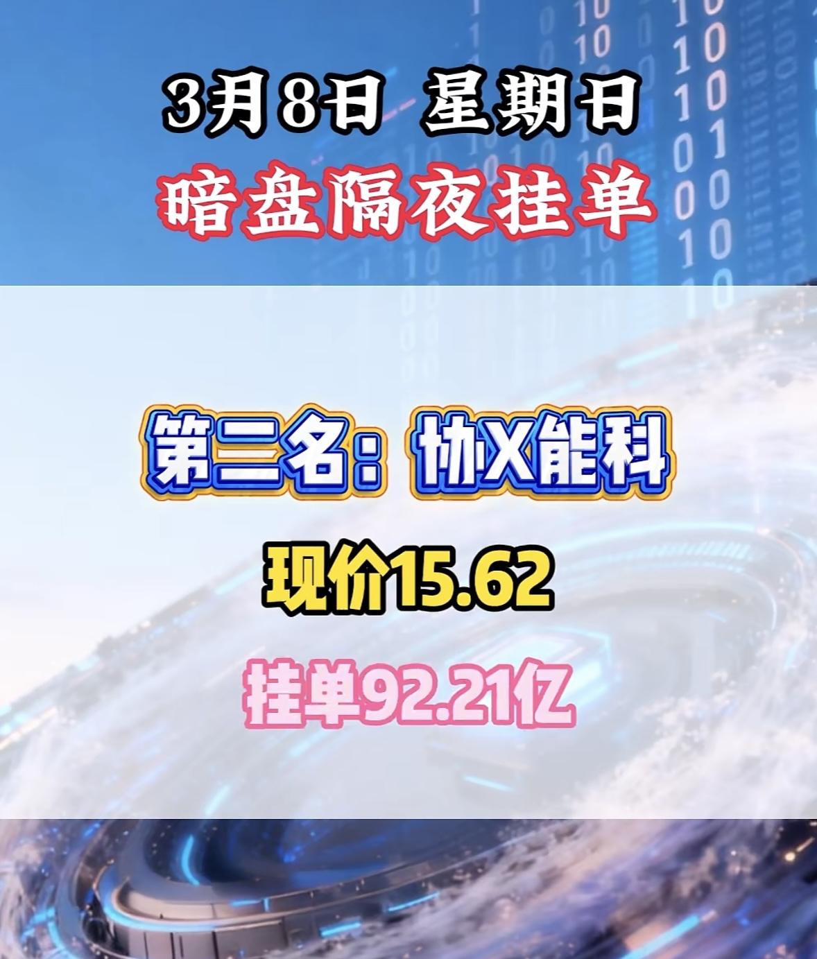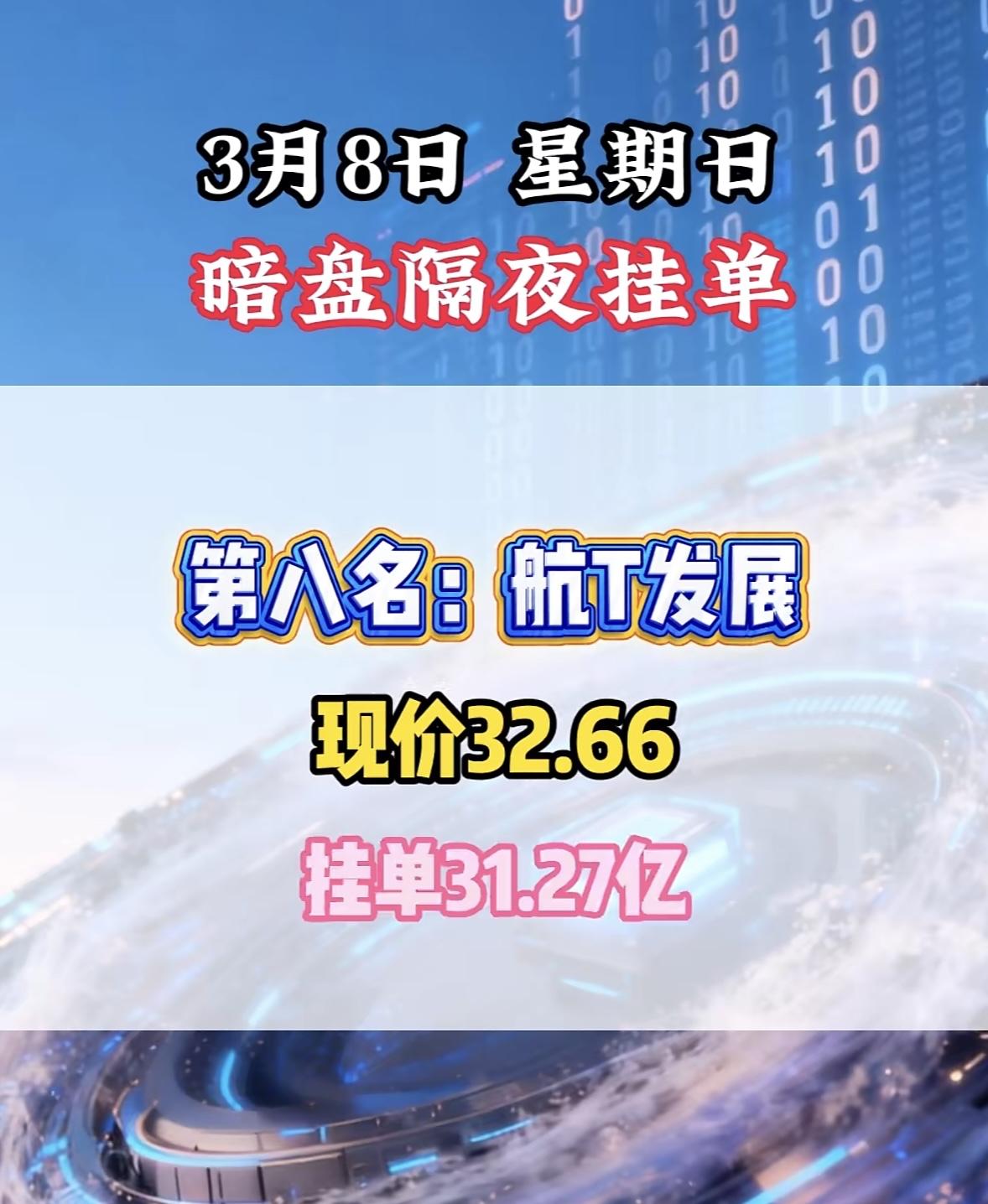 3月8日暗盘隔夜挂单前8名个股揭晓。 航天发展现价32.66,挂单31.27亿! 暗盘隔夜挂单火爆,全K新能领跑,现价飙升,挂单量惊人,市场热度高涨。