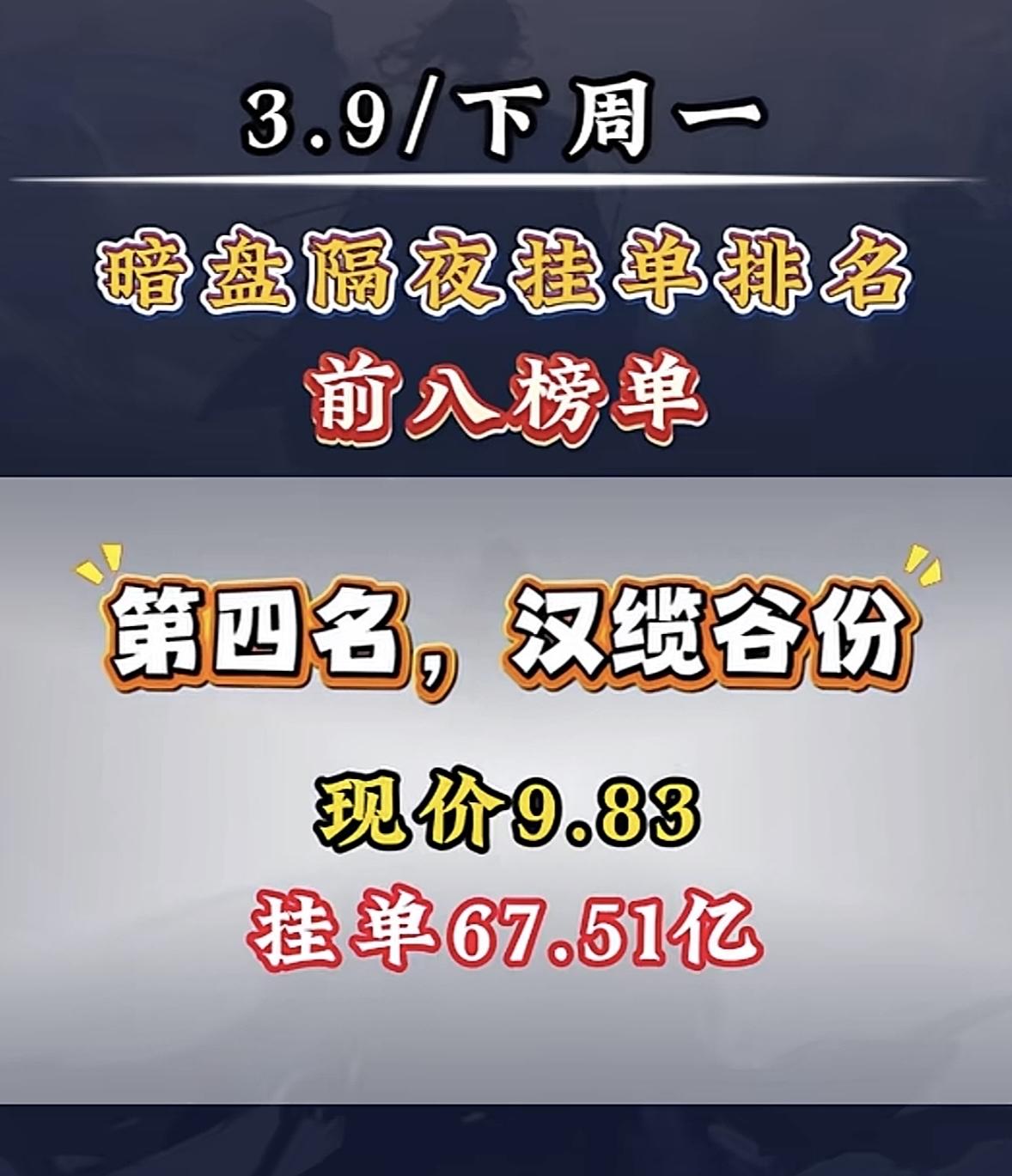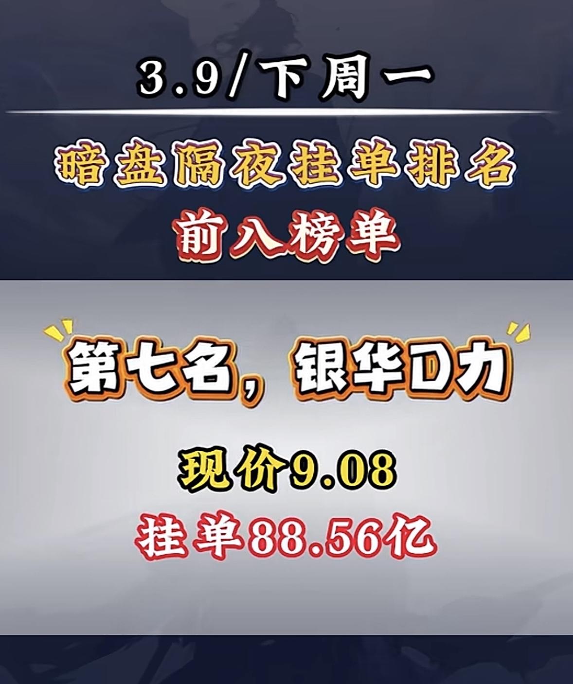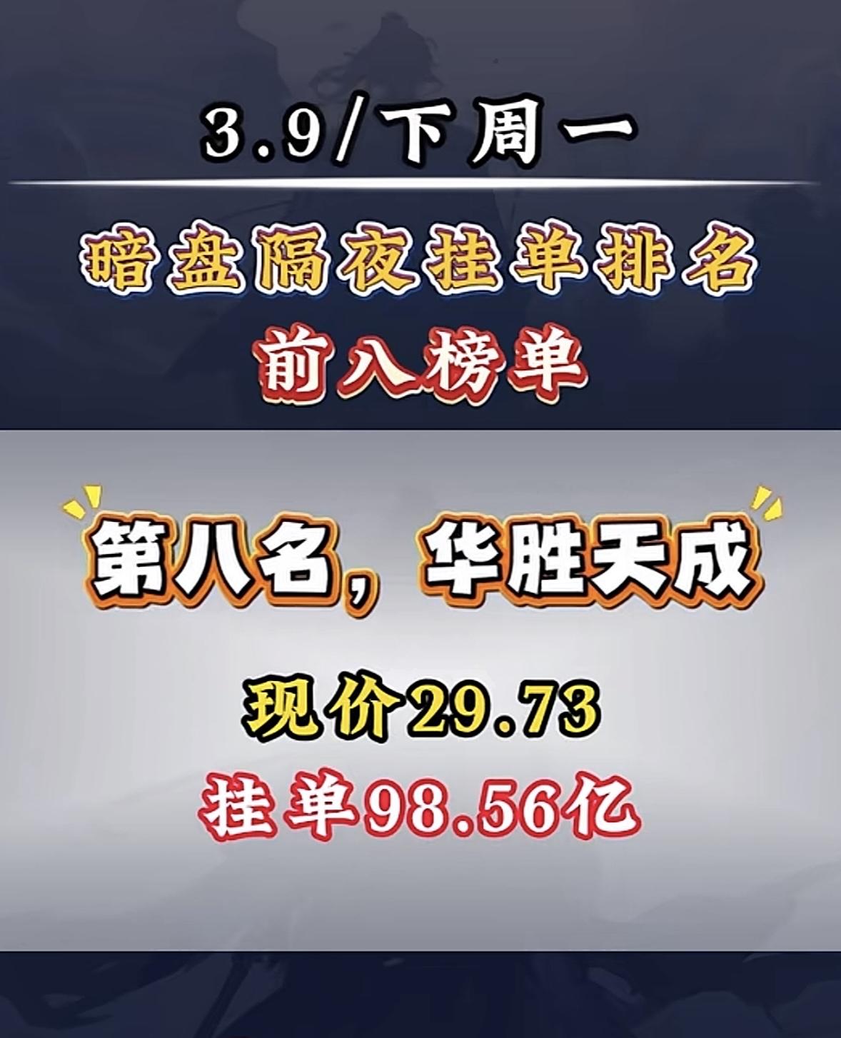 3月9日暗盘隔夜挂单前8名排名这事儿挺让人期待的。就说华胜天成,现在股价29.73,挂单金额居然高达98.56亿,这数字太惊人了。这么大的挂单量,感觉背后肯定有大动作。是有机构看好它的发展前景,还是有什么潜在利好消息呢?下周一是个关键节点,结果一揭晓,说不定会引起市场的一阵波澜。如果走势符合预期,那参与挂单的投资者可就赚翻了;要是不如人意,估计也会有不少人捶胸顿足。大家都在拭目以待,看看华胜天成到底能带来怎样的惊喜或惊吓。