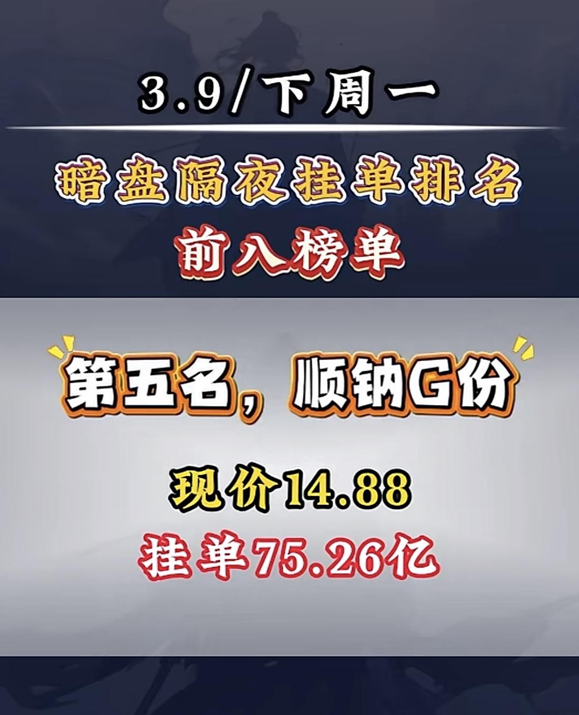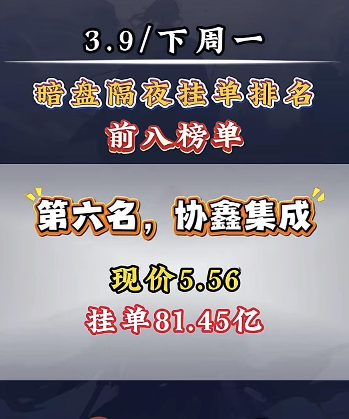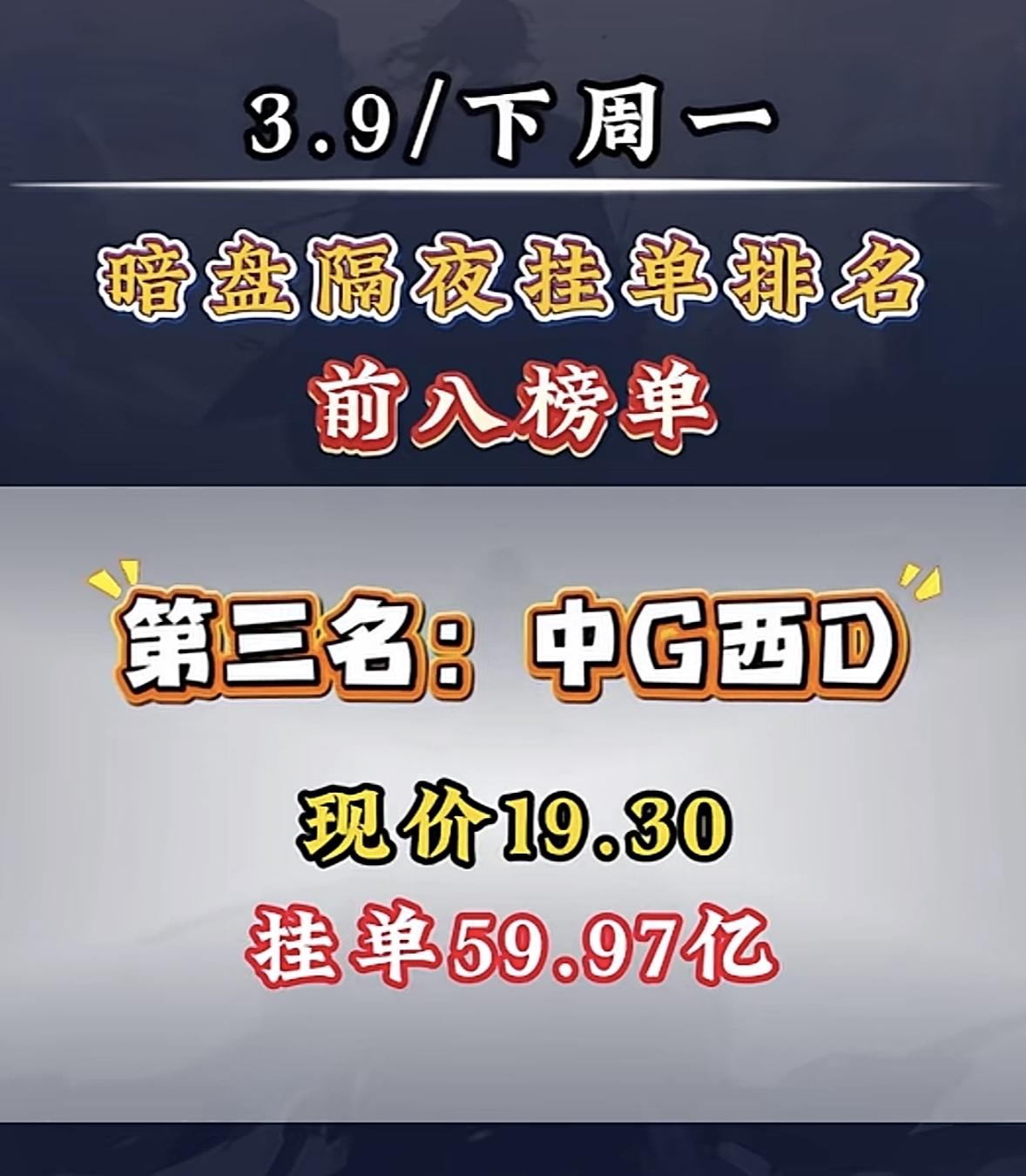3月9日暗盘隔夜挂单前8名排名这事儿挺让人期待的。就说华胜天成,现在股价29.73,挂单金额居然高达98.56亿,这数字太惊人了。这么大的挂单量,感觉背后肯定有大动作。是有机构看好它的发展前景,还是有什么潜在利好消息呢?下周一是个关键节点,结果一揭晓,说不定会引起市场的一阵波澜。如果走势符合预期,那参与挂单的投资者可就赚翻了;要是不如人意,估计也会有不少人捶胸顿足。大家都在拭目以待,看看华胜天成到底能带来怎样的惊喜或惊吓。