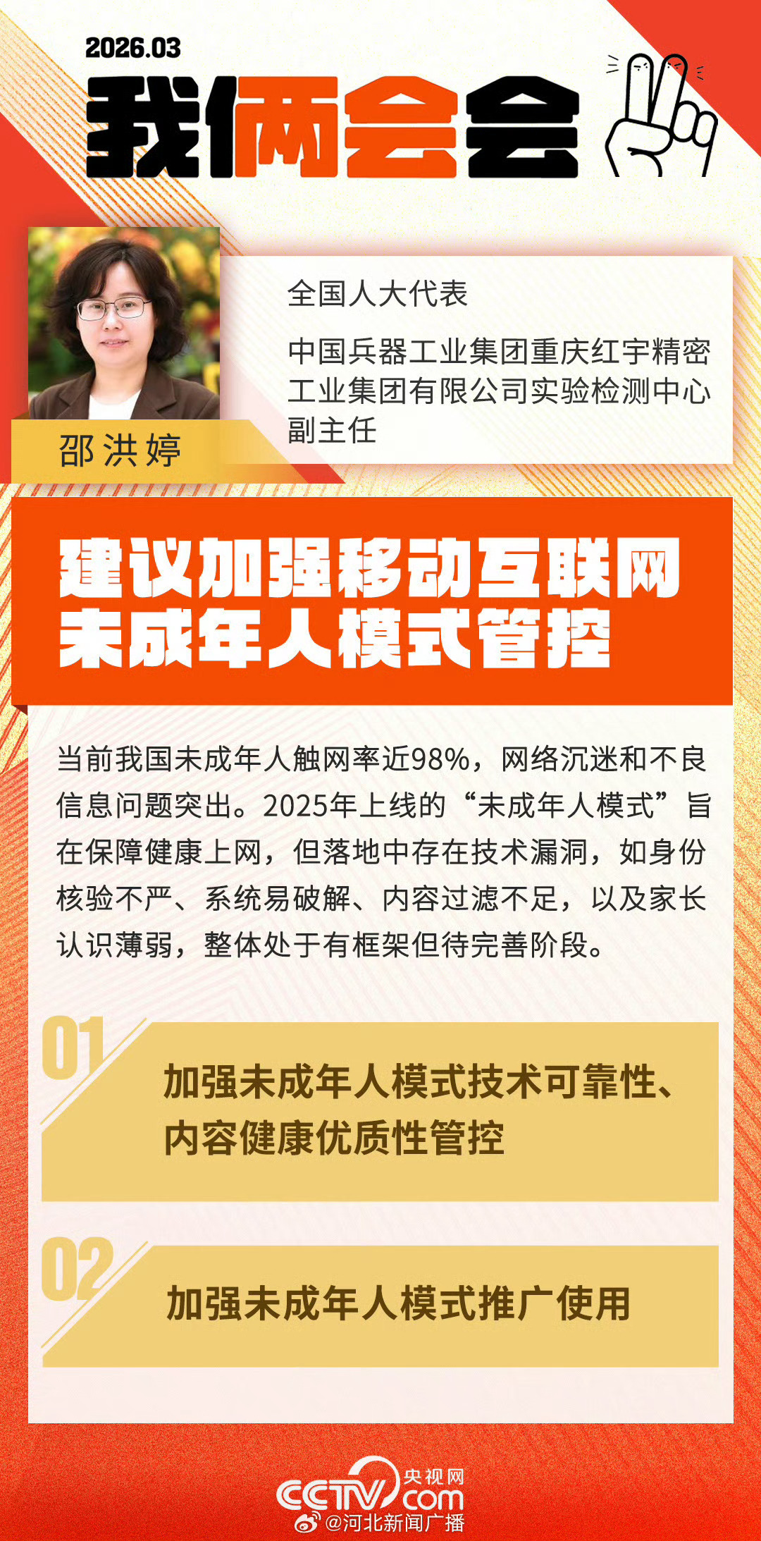 【#代表谈未成年人模式仍存漏洞#】#建议加强未成年人模式身份核验# 当前我国未成年人触网率近98%,网络沉迷和不良信息问题突出。2025年上线的“未成年人模式”旨在保障健康上网,但全国人大代表、中国兵器工业集团重庆红宇精密工业集团有限公司实验检测中心副主任邵洪婷调研中发现,“未成年人模式”落地中存在技术漏洞,如身份核验不严、系统易破解、内容过滤不足,以及家长认识薄弱,整体处于有框架但待完善阶段。