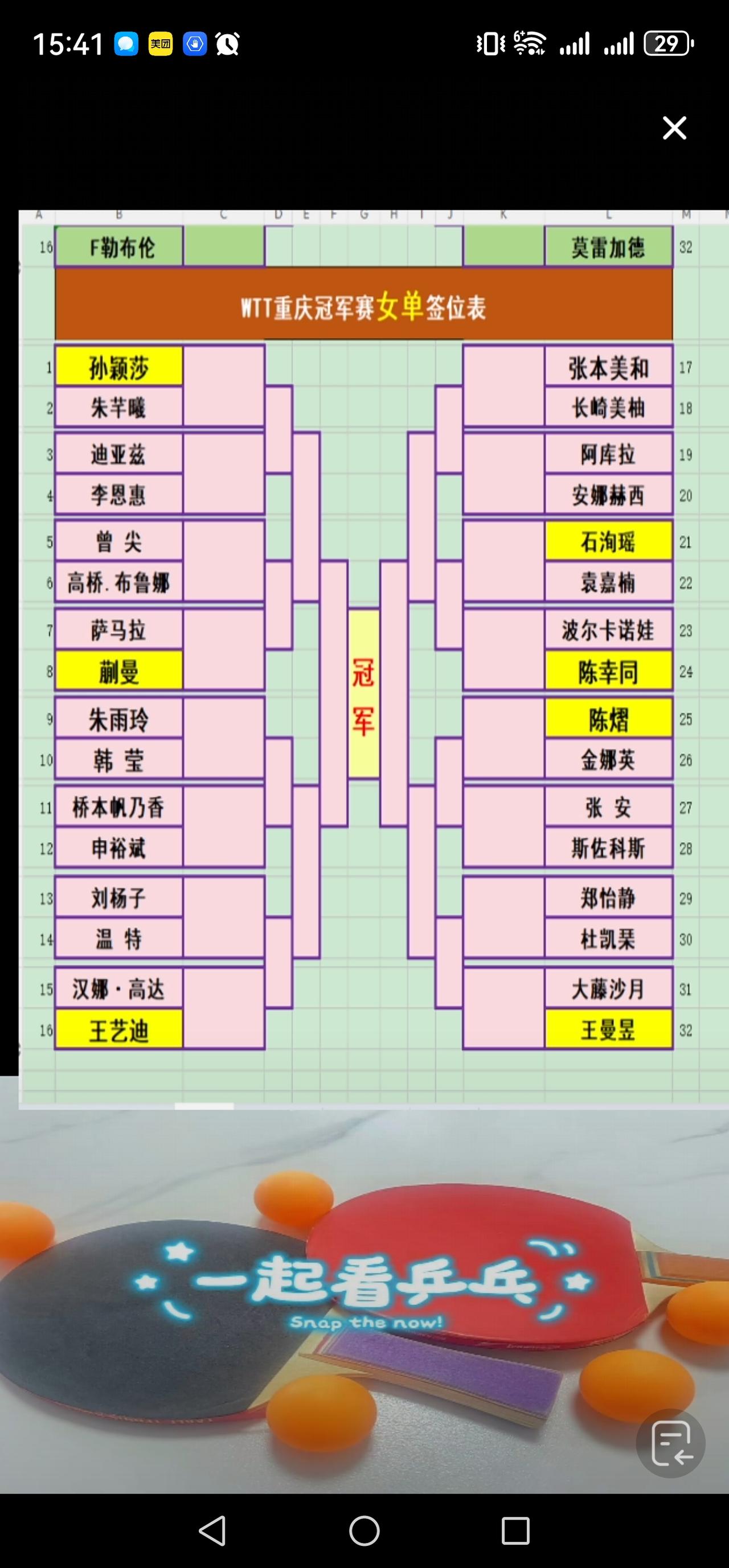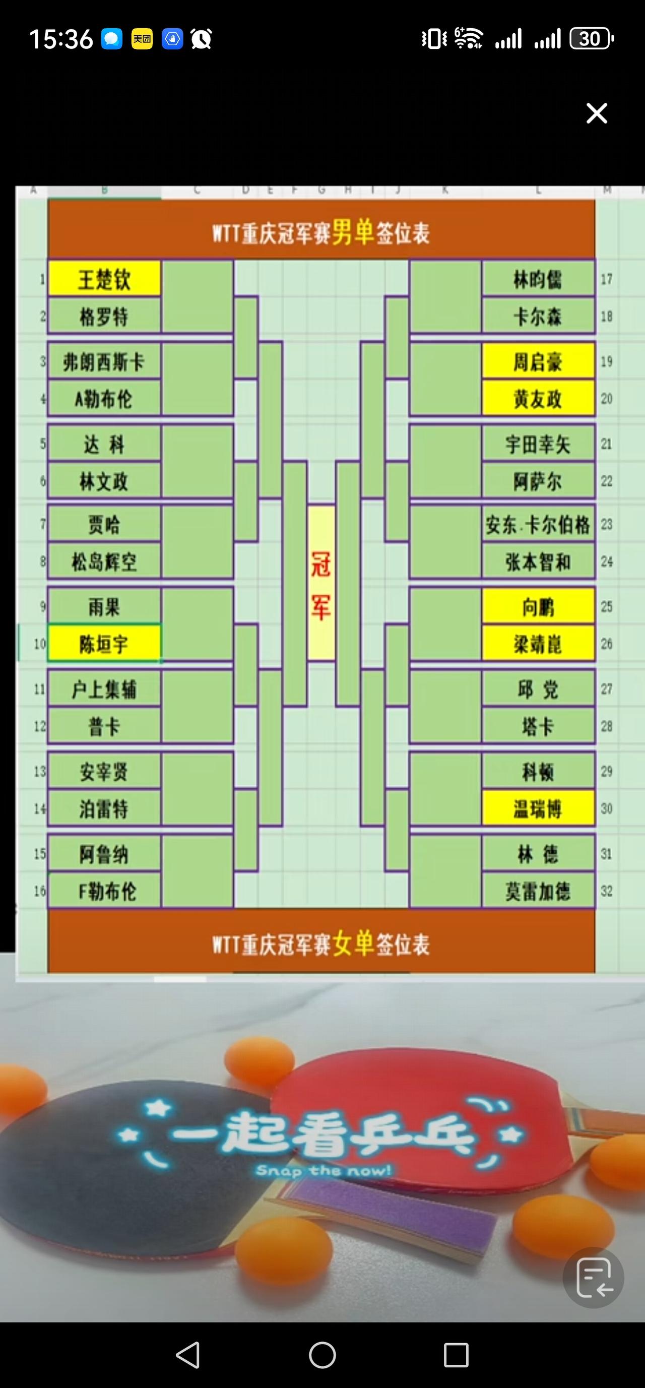 重庆冠军赛签位表,国男乒首轮两场内战,陈垣宇再战雨果 3月8日15:00,举行WTT重庆冠军赛的抽签仪式,男单签位表一轮艰难,女单签位表相对容易。 男单签位表一轮两场内战。3/4区国乒有周启豪和黄友政两人,遗憾的是两人第一轮便是内战,第二轮十有八九对中国台北的林昀儒,又是一场硬仗,若侥幸过关,则大概率面对张本智和。4/4区国乒集中梁靖崑,向鹏和温瑞博3人,可惜的是梁靖崑和向鹏第一轮又是内战。温瑞博若能过科顿一关,则要直面莫雷加德,看看能不能来个超水平发挥干掉小莫。 焦点之战是2/4区第一轮陈垣宇PK雨果卡尔德拉诺。两人刚刚在新加坡大满贯赛交过手,陈垣宇3:1破敌,重庆冠军赛两人首轮再次遭遇,如果陈垣宇能再次取胜,那就是实力大涨,决不是意外爆冷了。 女单签位表总体不错。2/4区王艺迪有困难,第二轮很可能遭遇莎宾温特,沙滨温特可是在新加坡大满贯赛中刚刚赢过王艺迪,若过关,则可能对战朱雨玲或桥本帆乃香,都不好打。3/4区,希望陈幸同和石洵瑶阻击张本美和成功。 愿国乒打出好成绩。