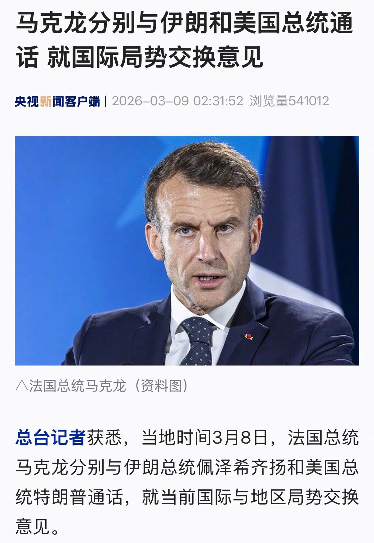 【#马克龙分别与伊朗和美国总统通话# 就国际局势交换意见】总台记者获悉,当地时间3月8日,法国总统马克龙分别与伊朗总统佩泽希齐扬和美国总统特朗普通话,就当前国际与地区局势交换意见。
