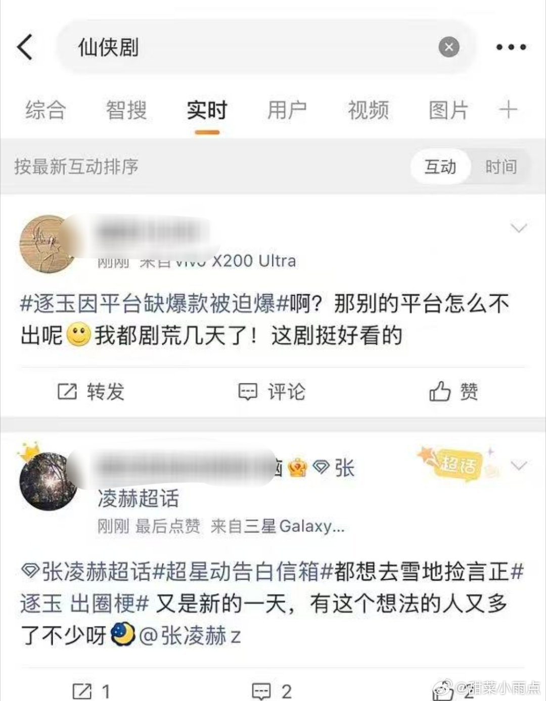 张凌赫、田曦薇《逐玉》微博指数破亿,被网友质疑数据造假,搜古装剧、仙侠剧等关键词,实时词条全被《逐玉》霸占。网传平台为捧剧修改数据统计通道,点开几秒就算看完,同平台在播剧都能蹭红利。郫县粉丝圈之前花钱冲数 据的粉丝集体喊退钱…氵的人尽皆知了这次,有什么意义呢?🤔 逐玉因平台缺爆款被迫爆