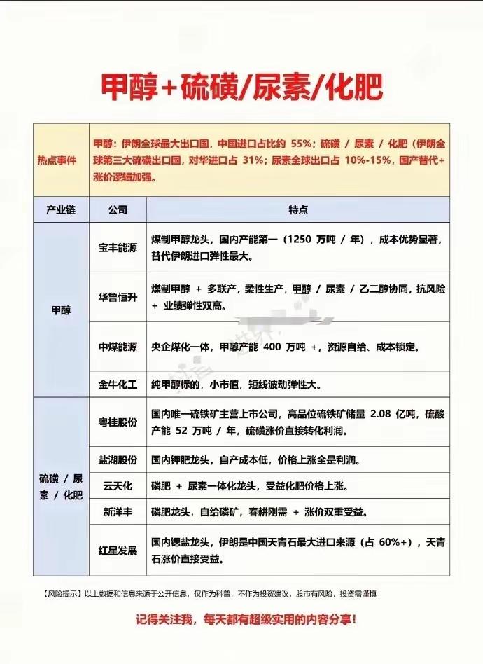🔥 油气之后·核心标的清单(化肥+种子+军工) 一、化肥(农业芯片,成本传导最直接) 氮肥(煤头优先,抗气价上涨) - 华鲁恒升(600426):煤化工龙头,尿素成本低20%,多元化工抗周期 - 湖北宜化(000422):煤/磷双资源,尿素+磷肥双轮驱动 - 阳煤化工(600691):尿素产能大,煤炭自给成本优势 磷肥(磷矿为王,全球供给收缩) - 云天化(600096):磷矿8亿吨,自给率100%,磷肥全球龙头,磷化工+新能源双赛道 - 兴发集团(600141):磷矿+精细磷化工,草甘膦+磷肥双主线 - 川金诺(300505):湿法磷酸净化,电池级磷酸铁放量 钾肥(资源垄断,全球定价) - 盐湖股份(000792):国内钾肥寡头,市占60%+,钾锂双主业 - 亚钾国际(000893):老挝百万吨级产能,海外资源,成本低30% 二、种子+种植(粮价上涨直接受益) 种业(转基因+粮食安全) - 隆平高科(000998):水稻龙头,转基因玉米品种领先 - 登海种业(002041):玉米种子市占15%+,转基因储备足 - 大北农(002385):转基因技术领先,安全证书多 - 农发种业(600313):央企种业,小麦种子市占第一,全产业链 种植(耕地资源) - 北大荒(600598):1296万亩耕地,粮价上涨直接增厚利润 三、军工(地缘冲突主线,贯穿全程) 无人机(实战消耗最大) - 中无人机(688297):翼龙系列,全球察打一体龙头,军贸出口第一 - 航天彩虹(002389):彩虹系列,全谱系无人机 导弹/远火/雷达(高消耗+信息化) - 中航沈飞(600760):歼击机龙头,导弹配套 - 航发动力(600893):航空发动机核心,军机刚需 - 雷科防务(002413):相控阵雷达,21亿大单2026交付 - 国睿科技(600562):防空导弹配套雷达 军工电子/通信(信息化核心) - 海格通信(002465):军用通信+北斗,订单饱满 - 振芯科技(300101):北斗导航芯片,军品份额第一 四、投资节奏建议 1. 短期(1-2周):油气/油运(情绪高潮)+ 化肥(尿素/磷肥涨价) 2. 中期(1-3月):种子+种植(粮价传导)+ 军工(冲突持续) 3. 关键信号:尿素破2800元/吨、布油站稳100美元、BDI跳涨 石油类股票 石化化工板块 化工周期股 油气资源板块 油气股票 化肥厂家走势 尿素化肥厂 化肥产业链 石化化工板块 化工周期股 化肥厂家走势 尿素化肥厂 化肥产业链 煤化工公司排名 农药化肥板块