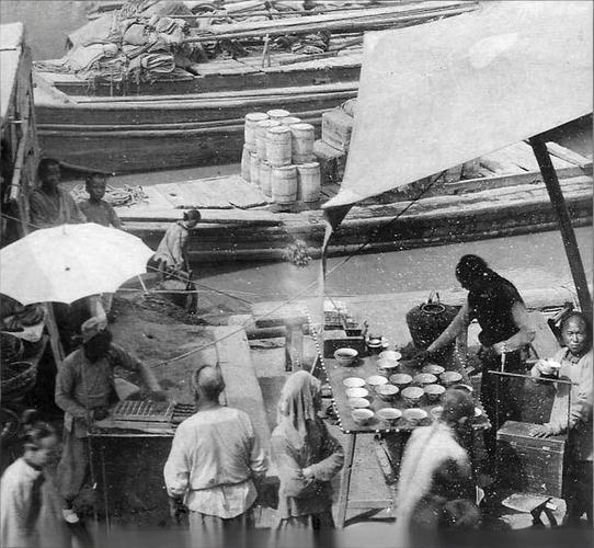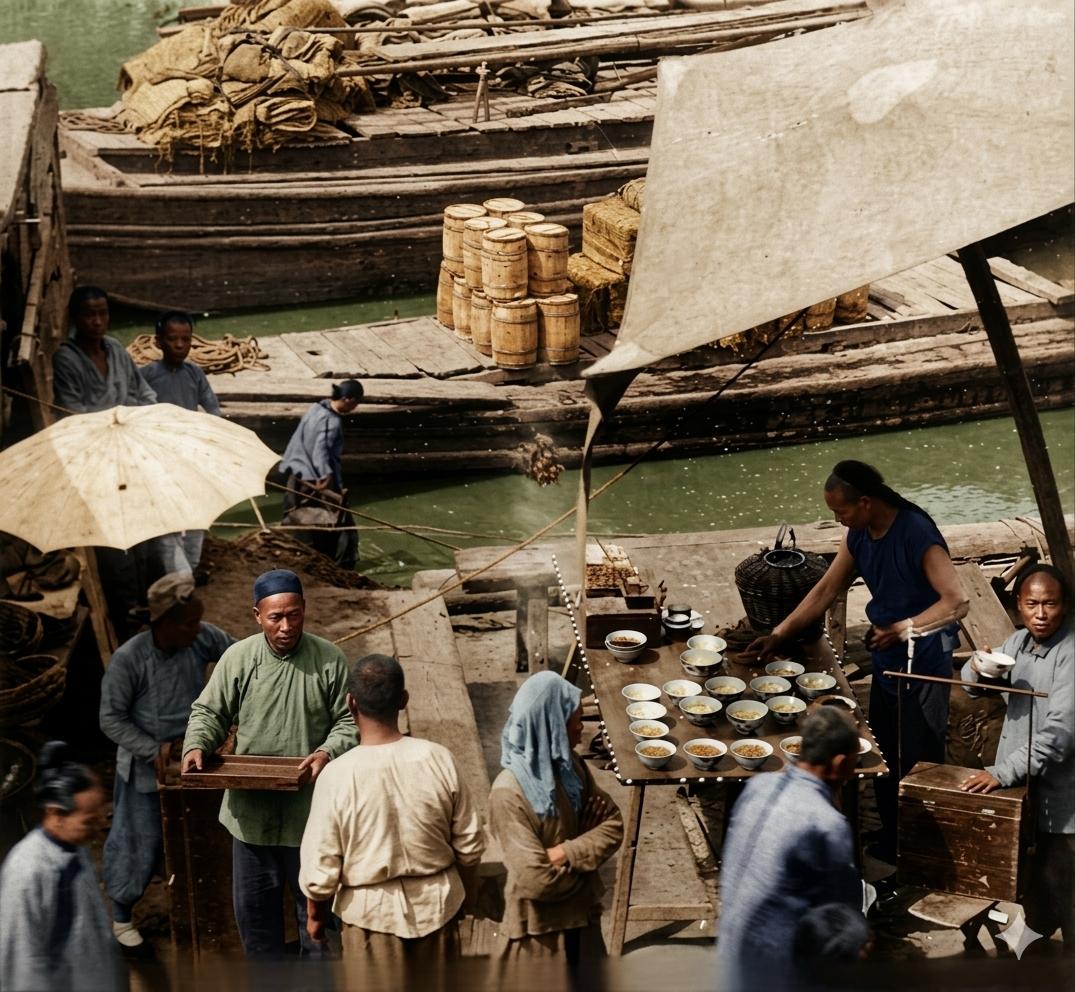 清末,天津海河码头,一个简易的茶摊支在河边,摊主正忙碌地为顾客斟茶。桌上整齐地摆放着十多个粗瓷大碗,为往来的苦力和路人提供解渴的饮品。 另一个小贩正在操作一个类似“拉洋片”的摊位,旁边有人撑着一把洋伞,这在当时是比较时髦的物品。几位留着长辫、穿着粗布短褂的男子正围在茶摊和小吃摊前,他们是码头的苦力或普通市民。河面上,几艘满载货物的木船停泊着,船上堆放着油桶和包裹,显示出这里繁忙的漕运和商业活动。 天津因河而兴,是南粮北运的重要枢纽。海河码头是当时最繁忙的区域,南来北往的漕船、商船在此装卸货物,催生了庞大的码头工人队伍和为他们服务的市井业态,茶摊便是其中之一。