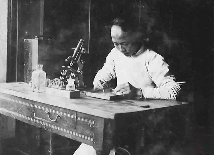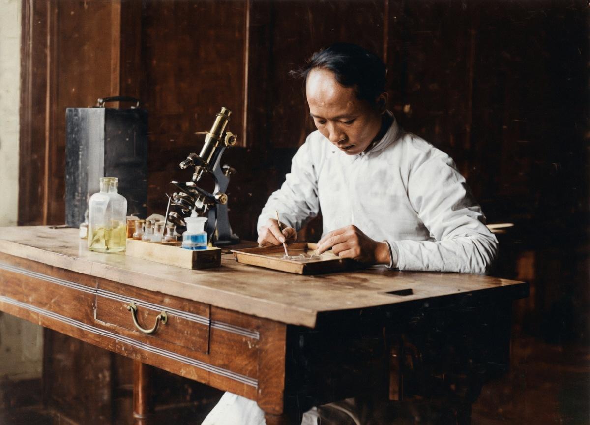 晚清,南京汇文书院生物实验室里,年轻学生正全神贯注地在木托盘上进行生物实验,很可能是在解剖标本,为后续的显微镜观察做准备。 桌上的黄铜显微镜是从欧洲进口的“高精尖”设备,在当时的中国极为罕见和昂贵。旁边的玻璃瓶、培养皿等实验器材,也显示出这所学校在教学上的先进性。 汇文书院由美国传教士于1888年在南京创办,是中国最早的新式高等学府之一。学校拥有当时国内一流的实验室和教学设备,除了生物课,学生还能在化学实验室里进行各种实验,甚至接触到了早期的电影放映机。在绝大多数读书人还埋头于四书五经、追求科举功名时,这里的学生已经在用西方的科学方法探索微观世界。