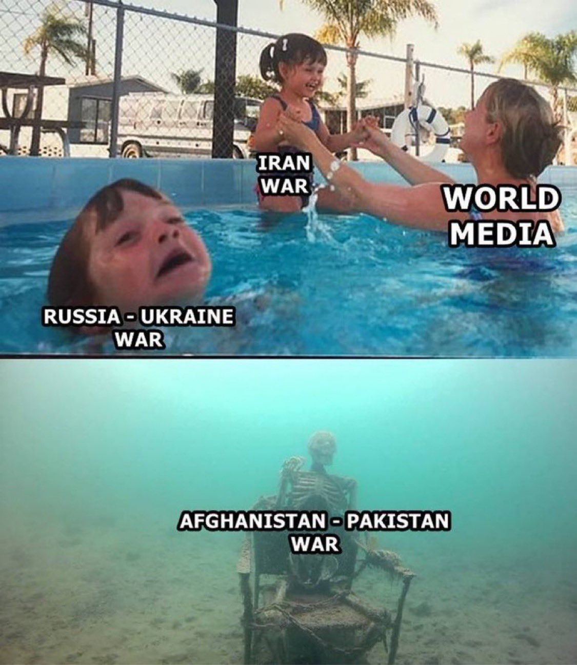 这张图用对比讽刺了媒体关注度的不平等。上半部分,代表“世界媒体”的人正积极关注“伊朗战争”和“俄乌战争”;下半部分,代表“阿富汗-巴基斯坦战争”的骷髅则被长期忽视,沉在水底。这反映了现实中,不同冲突获得的国际关注度存在巨大差异。