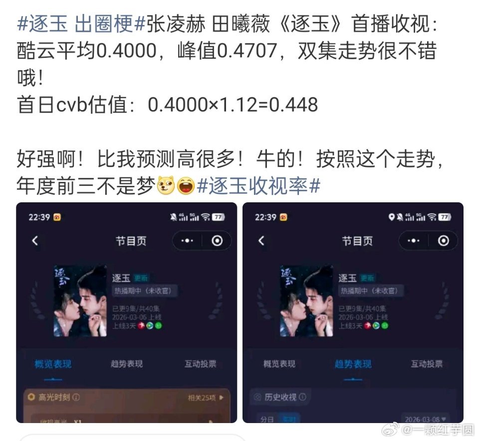 逐玉首日CVB 0.453!!卫视第一!CVB是相当权威的了!也是第一田曦薇张凌