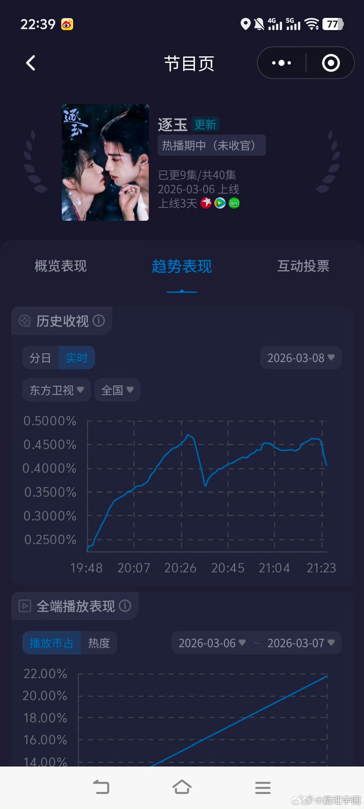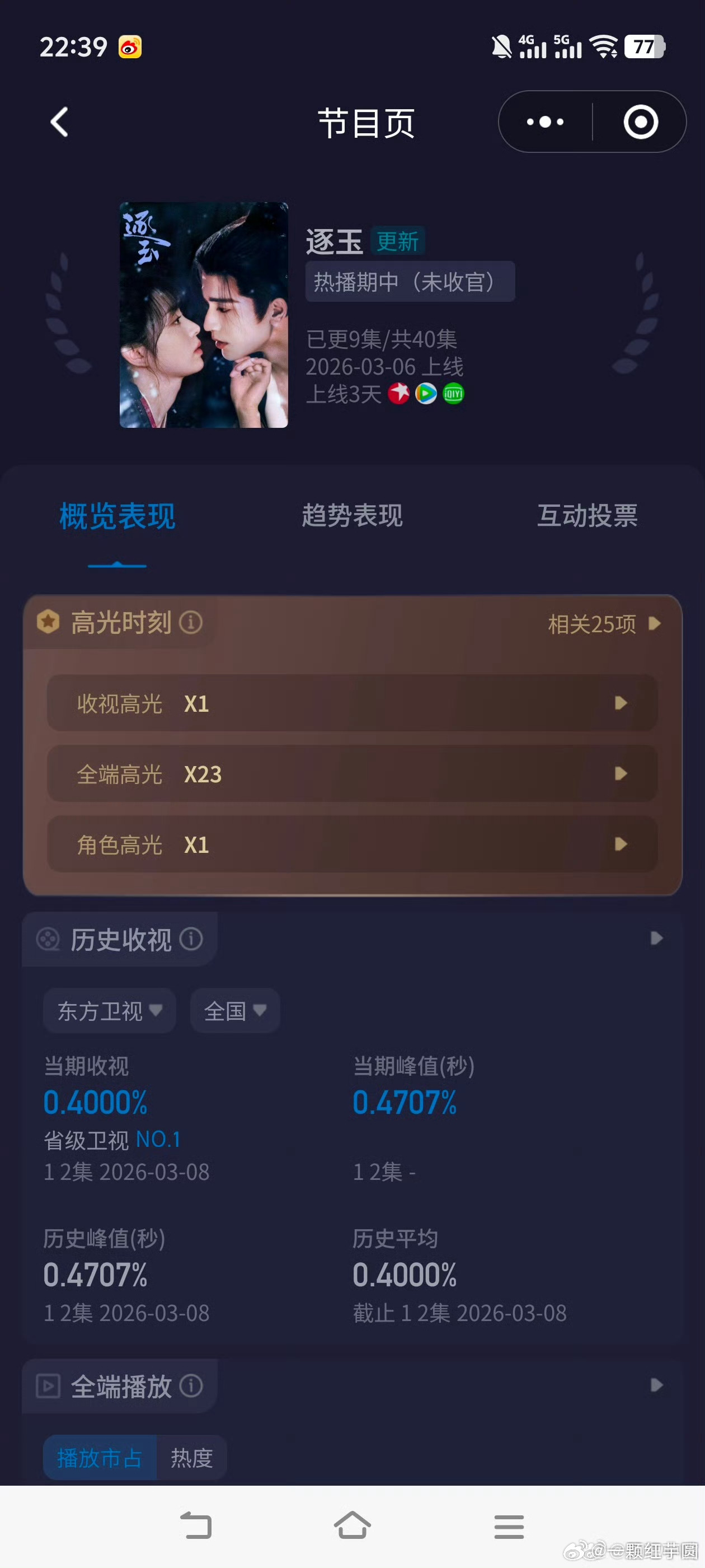 逐玉因平台缺爆款被迫爆《逐玉》昨晚上星东方卫视,酷云均值0.400,走势蛮不错