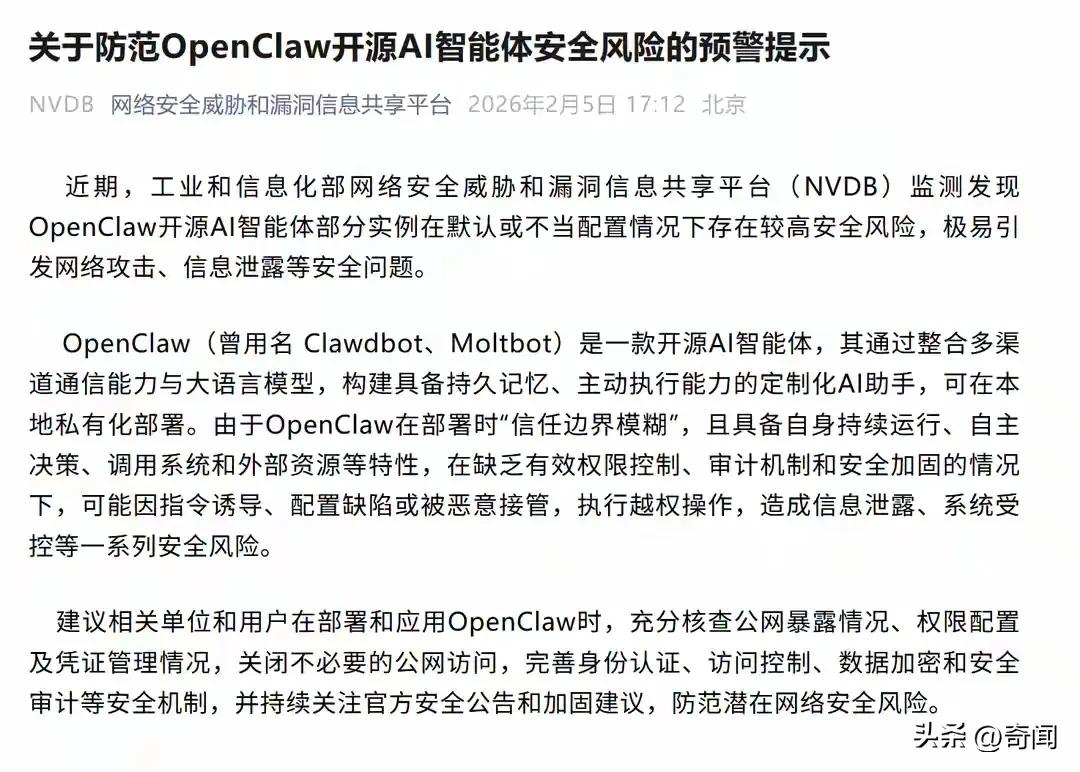 突然爆火的AI龙虾-OpenClaw被工信部点名谨慎安装使用,非熟悉系统安全者安装后可能存在漏洞,数据安全有极大风险。3月8日,我国工业和信息化部发布软件安全提醒通知,对类似“AI龙虾”的智能体应当理性看待。 专家表示,类OpenClaw的新型智能体实际上是在现有的语言大模型的基础上,增加了操作系统OS对接功能,把“只能和AI聊天”变成“可以让AI控制电脑输出”,比如:“打开c盘检查下某代码文件是否有错误”、“帮我整理理解xx文档内容写概要设计输出到d盘”、“给我打印某某文档”等。 这实际上就是给OpenClaw软件放开了极大了操作系统权限,包括“鼠标、键盘、内存、摄像头、打印机等等”,让它全权管理,这样风险极大,谁知道OpenClaw会不会自己更新版本“携带木马功能”,请则盗取数据文件、偷拍内容,重则监控你的日常行为、半夜用你电脑跑挖矿等。 大量使用者也说其实OpenClaw的功能更适合软件开发从业者和办公管理,并不适合普通市民,就是一个噱头,因为其安装复杂还出现“200元帮安装龙虾”这个新行业,更是不可理喻。专家还建议:单位使用建议物理隔离不要接入互联网,以保证数据安全。 作者也认为,普通人的电脑手机不外乎就拿来聊天、打游戏、看电影听歌等作用,安装OpenClaw纯粹毫无意义,顶多觉得神奇“装B”玩两天,实际没有使用场景和作用,不必要花费几百元安装一个隐患在那里。 最后就是这类软件的本身问题,使用者表示实际应用过程中经常出现报错、不执行、结果有问题等情况,并不是广告和流传的那么好用,那都是“实验室演示效果”,就好比汽车广告的“理论平均油耗”,基本是达不到。而且还需要消耗大量AI智能体token,后期消费可能是无底洞,不熟悉者一定要慎用。 龙虾AI 龙虾智能体 工信部提醒谨慎安装使用“AI龙虾” “养龙虾”存在安全风险 工信部紧急提醒 OpenClaw安全吗