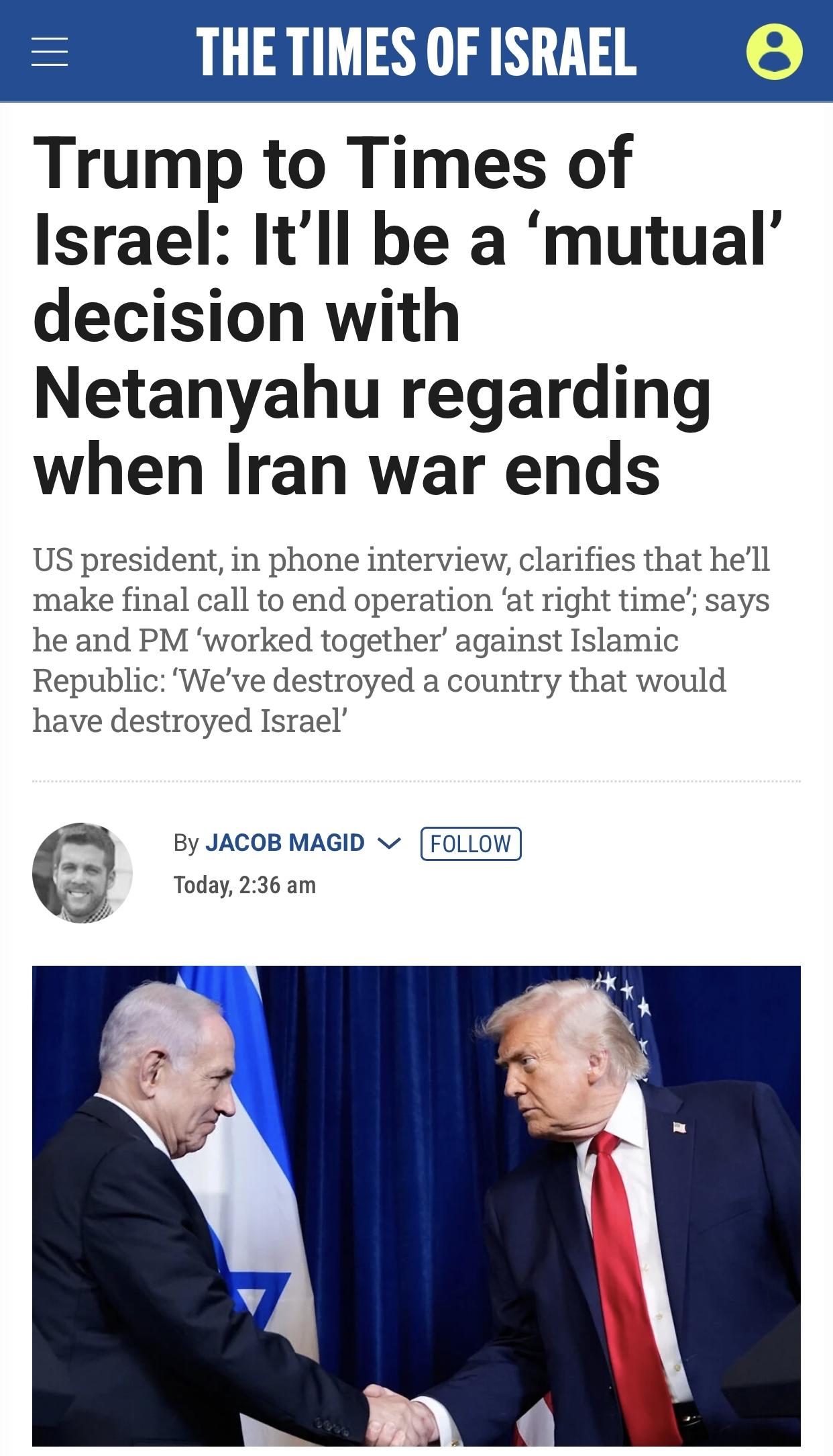 以媒:特朗普称”会与内塔尼亚胡讨论何时结束伊朗战争” 以色列《以色列时报》官网当地时间3月8日报道:美国总统特朗普周日告诉《以色列时报》,他将与内塔尼亚胡总理一起决定何时结束与伊朗的战争。 报道说,特朗普还在简短的电话采访中声称,如果他和内塔尼亚胡不在其位,伊朗就会摧毁以色列。“伊朗原本打算摧毁以色列及其周边的一切……我们携手合作。我们摧毁了一个想要摧毁以色列的国家”。 报道说,美国总统被问及”是否由他独自决定与伊朗的战争何时结束,或者内塔尼亚胡是否也有发言权”问题时, 说“我认为这是相互的……有点吧。我们一直在讨论。我会在合适的时候做出决定,但一切都会被考虑在内”,并表示,虽然内塔尼亚胡会可以建议,但美国总统将拥有最终决定权。 在被问及”美国决定停止打击后,以色列是否还能继续对伊朗开战”问题时时,特朗普拒绝考虑这种理论上的可能性,并补充道:“我认为这没有必要”。 报道说,特朗普一直试图避免被锁定在特定的战争时间表上,但白宫新闻秘书莱维特上周五曾表示,华盛顿预计战争将持续四到六周。 报道的原标题是《Trump to Times of Israel: It’ll be a ‘mutual’ decision with Netanyahu regarding when Iran war ends》(特朗普告诉《以色列时报》,伊朗战争何时结束将与内塔尼亚胡商量决定)。