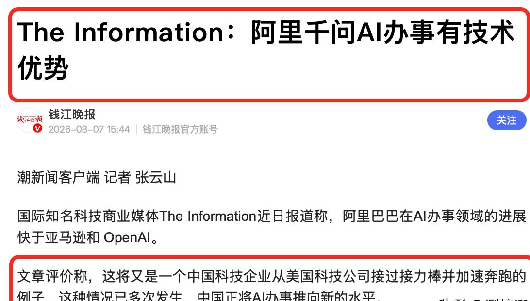 美国没想到,中国这次玩真的了!更没想到,美国媒体也支持中国! 谁也没料到,2026年的春节,中国科技圈没比红包、没比流量,反倒掀起了一场AI大混战,直接把海外媒体看懵了。 美国知名科技商业媒体The Information近日就发布了一篇报道,阿里巴巴在AI办事领域的进展快于亚马逊和 OpenAI。 亚马逊是全球电商巨头,OpenAI更是ChatGPT的母公司,一直被视为AI领域的“风向标”,如今被中国公司反超,连美国媒体都忍不住认可,足以说明中国AI这次是真的玩真的,不是虚晃一枪。 报道里提到,现在OpenAI、谷歌、亚马逊都在扎堆进军AI购物领域,但都遇到了不小的麻烦——AI要处理复杂的电商数据,卖家的库存、价格随时在变,还要打通支付环节,难度极大。 就连OpenAI都扛不住,最近因为技术限制,不得不调整电商战略,放弃了在聊天界面直接完成支付交易的计划。 而阿里巴巴则不一样,凭借自身的生态优势,一路领跑。 报道援引摩根士丹利的报告数据,春节期间,阿里旗下的AI助手千问搞了一场营销活动,直接让APP日活从1700万暴涨到7350万,短短几天内,用户通过千问预订奶茶、电影票、机票等各类商品的订单量就达到了2亿单,这个数据连亚马逊看了都得眼红。 千问不是只停留在“帮你找信息”的层面,而是能直接帮你办成事,不用跳转多个APP,一句话就能完成从下单到支付的全流程。 比如你说“帮我订周末去厦门的机票和环岛路的海景民宿”,千问会自动对接飞猪筛选航班、匹配符合偏好的民宿,还会用高德地图生成行程导航; 点奶茶时,它能自动匹配你3公里内的店铺,叠加账户红包,通过支付宝一键支付,全程不超过30秒。这种“能办事”的AI,正是美国巨头们目前难以实现的,也是The Information认可中国AI的核心原因。 报道里还特意提到,阿里的优势在于“全生态闭环”——有自己的自研大模型,有淘宝、支付宝这样的电商和支付平台,还有高德、飞猪、大麦网等各类服务场景,相当于把AI放在了一个“万能工具箱”里,能调用各种资源,自然比亚马逊、OpenAI这种需要多方合作的模式更高效。甚至有外媒评价,这又是一次中国科技企业从美国公司手里接过接力棒,然后加速奔跑的例子。 其实不光是美国媒体,就连《人民日报》都关注到了中国AI的突破,说阿里千问这样的AI助手,正在从“猜你喜欢”变成“懂你需要”,真正融入了普通人的日常生活。 现在,千问的衍生模型已经突破20万个,下载量超过10亿次,甚至有60岁的老人学会用它点外卖、买大米,彻底打破了AI是“精英玩具”的刻板印象。 以前美国总觉得自己在AI领域稳坐第一,觉得中国AI只是“跟风模仿”,但这次春节的AI混战,还有美国媒体的公开认可,彻底打破了这种偏见。 中国AI没有走美国巨头的老路,而是扎根普通人的生活,把“能办事”作为核心,这种接地气的发展方向,反而走出了一条属于自己的快车道。 美国没想到,中国这次是真的下定决心深耕AI落地,更没想到,连自己家的权威科技媒体,都会用实打实的数据和事实,认可中国AI的领先优势。 这场AI混战不是一时热闹,而是中国科技实力的一次集中展示,未来,当中国AI继续在办事、民生等领域深耕,或许还会带来更多让世界意想不到的惊喜。