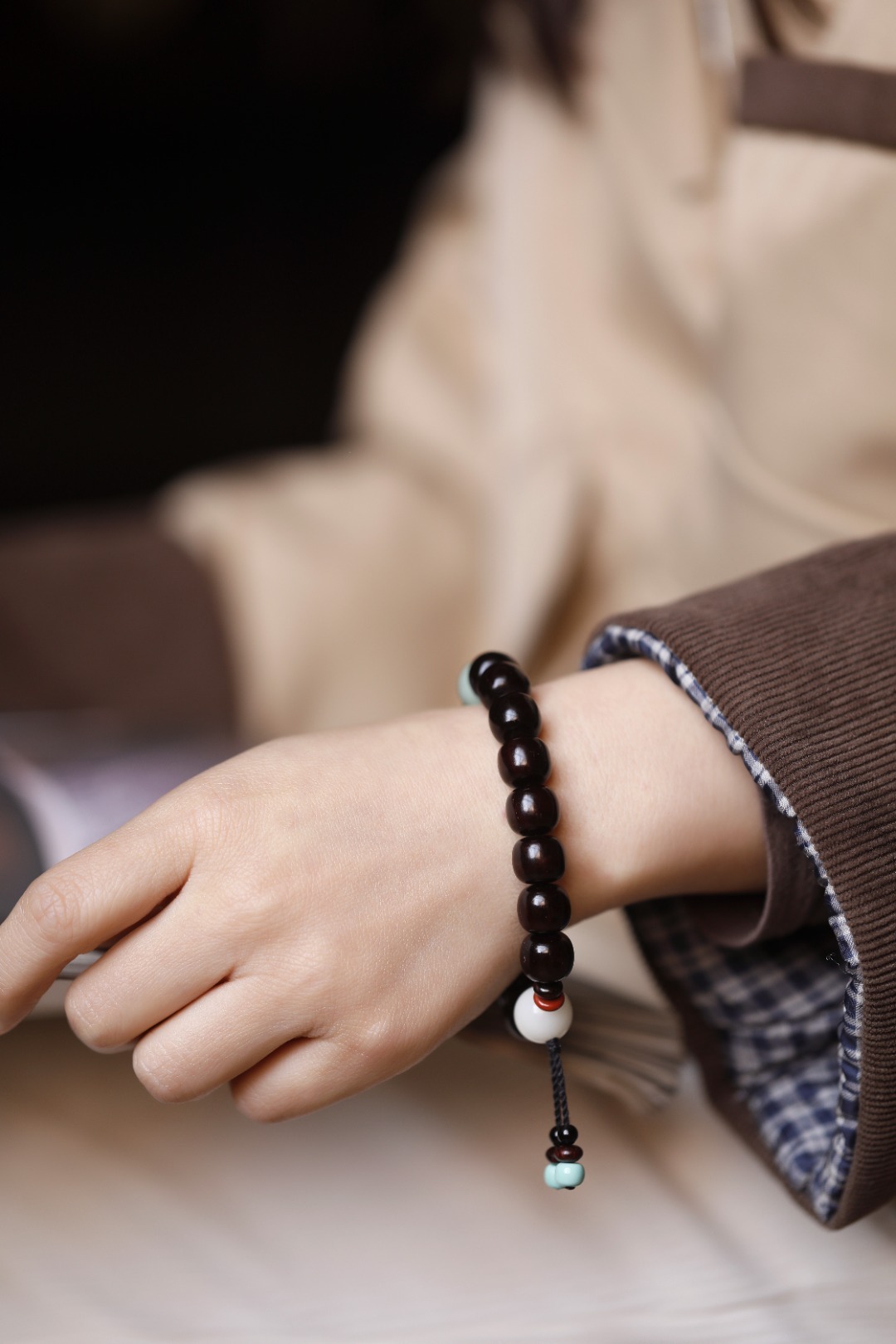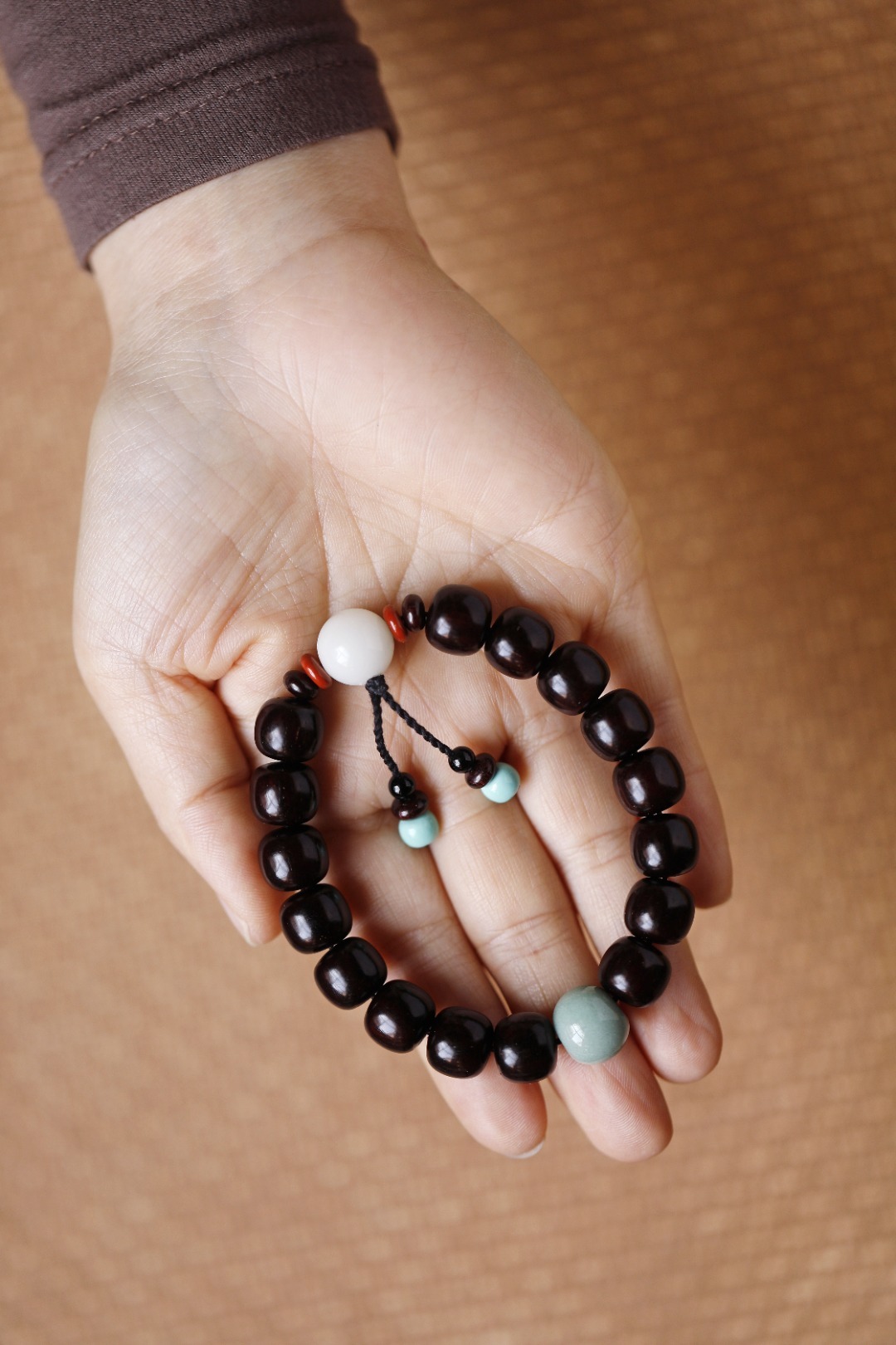 高密紫檀包浆老料,手工穿编,珠子层层打磨,颗颗包浆油润;各种配饰加以点缀,端庄雅致。