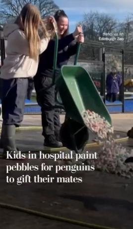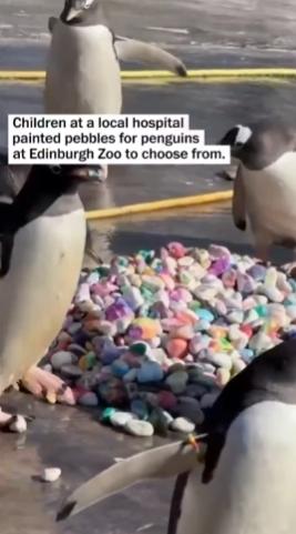 【爱丁堡动物园的雄性巴布亚企鹅为了吸引雌性,会向它们赠送漂亮的鹅卵石,以此表达爱意。 这些石头是由目前在医院接受治疗的儿童绘制的。】