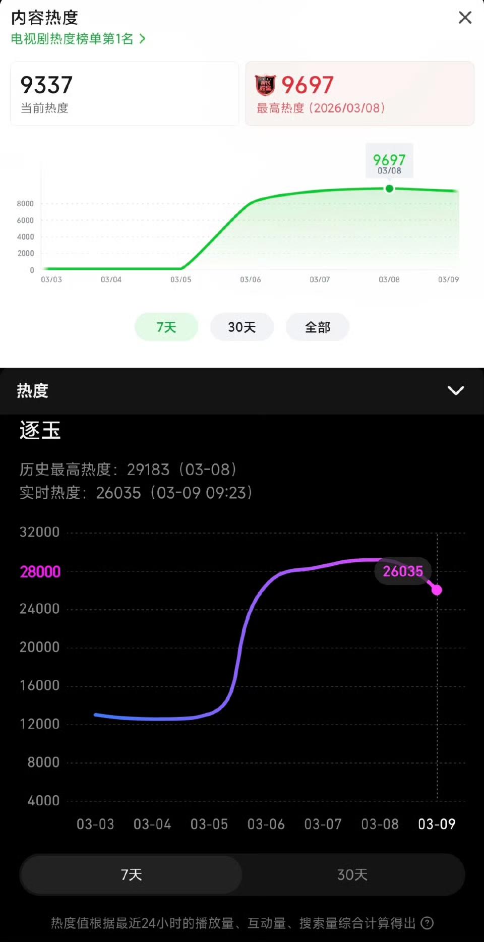 逐玉数据狂飙超狂飙?是真热还是平台硬造爆款 《逐玉》开播就炸场,次日播放量直接赶超《狂飙》第四天数据,张凌赫和田曦薇颜值与流量双在线,稳稳扛住基本盘。可这波爆火看着总有点不对劲,开年剧圈冷清,双平台缺爆款,直接把它按头推上顶流,热搜铺天盖地,数据一路飘红。 但剧里没出圈名场面、没全民爆梗,身边聊的人也不多,负面吐槽还不少。数据很疯狂,体感很冷清,这哪是真爆火,分明是天时地利加平台强推的“人造爆款”,离全民级还差一大截。