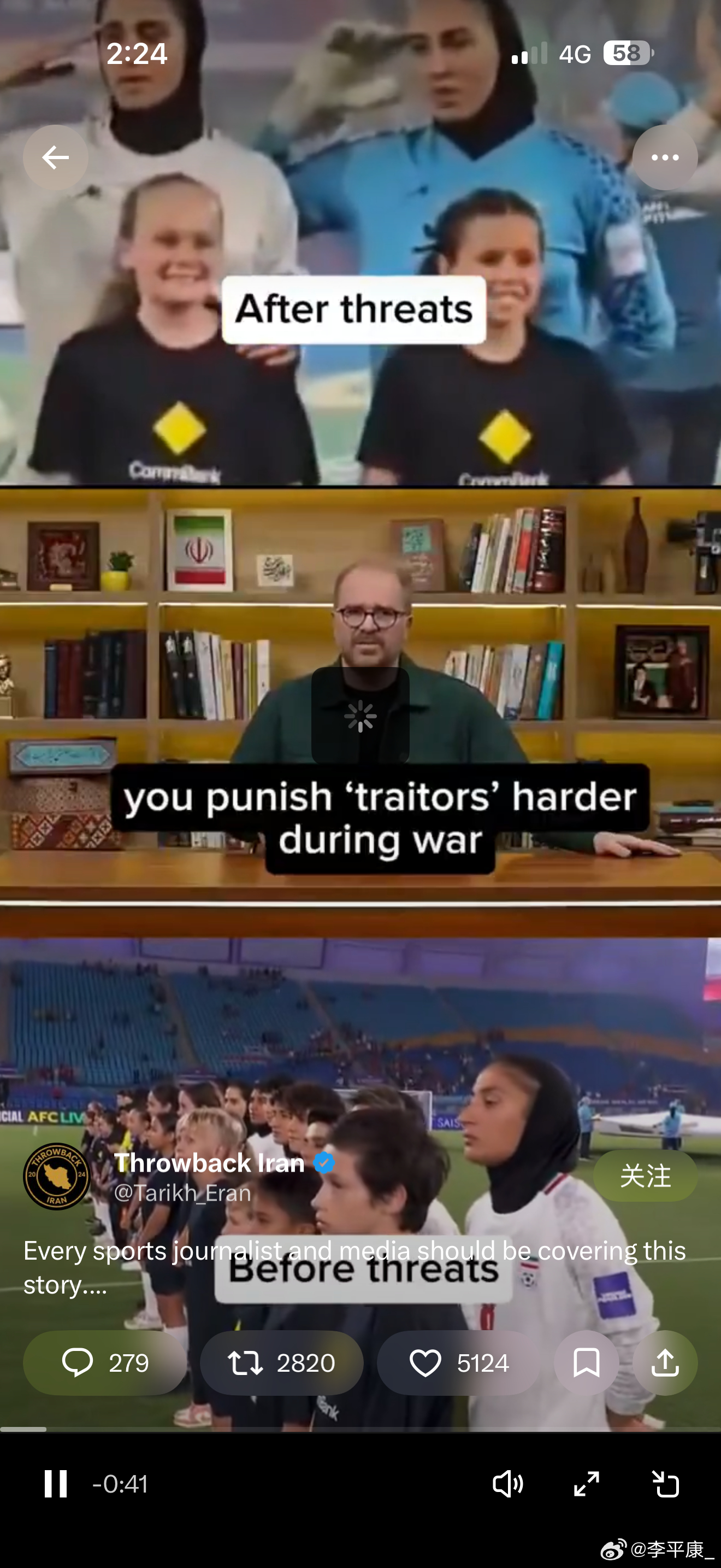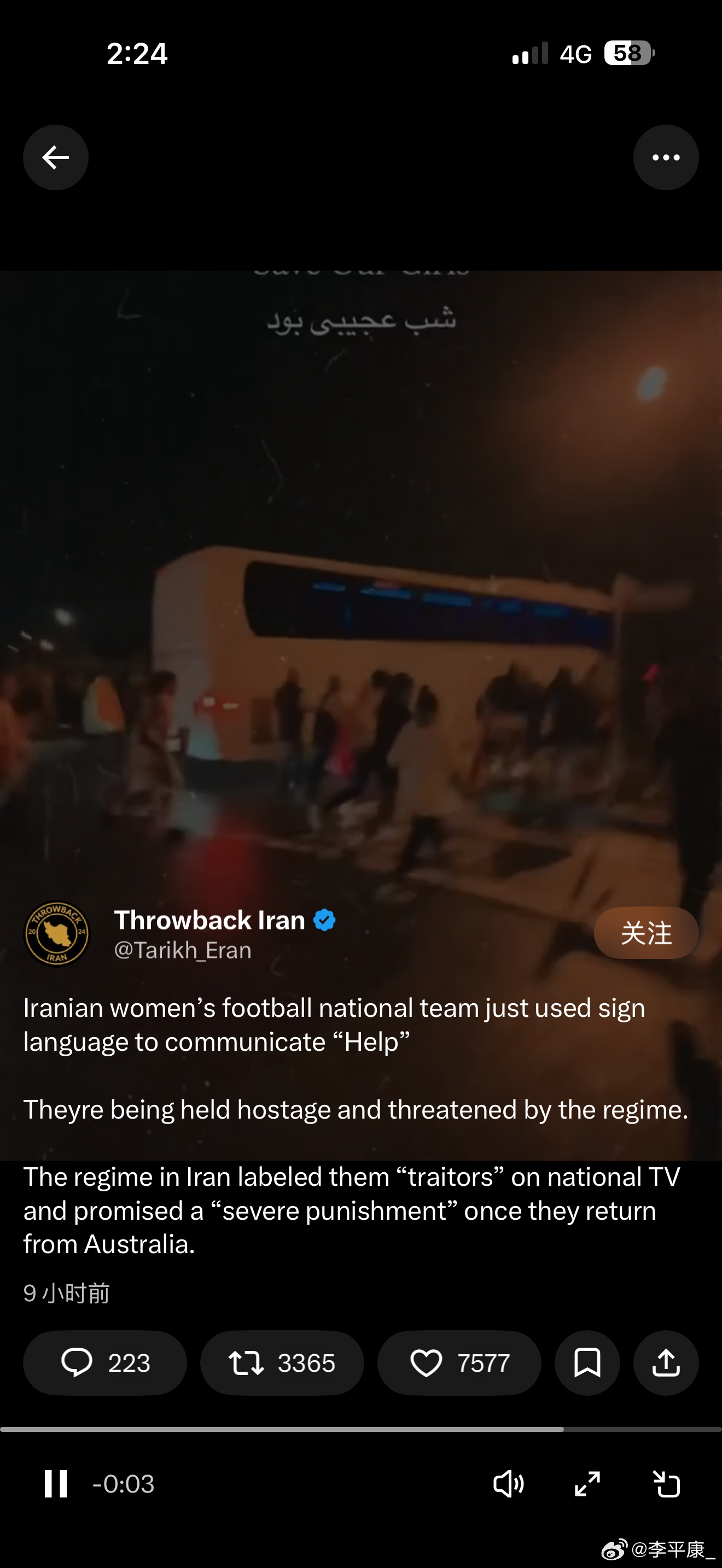 伊朗女足拒绝唱国歌 昨天伊朗女足结束亚洲杯全部比赛启程离开的时候,有人看到大巴车内的球员做出“求救”手势,有不少澳洲的伊朗移民试图拦车请求澳洲政府留下她们“避难”。看到她们的处境,真的感到揪心,也对那些攻击辱骂她们的“网络狂徒”感到羞耻和痛恨!不管怎样,祈祷她们平安,也希望这场战斗能把那些恶魔消灭干净!