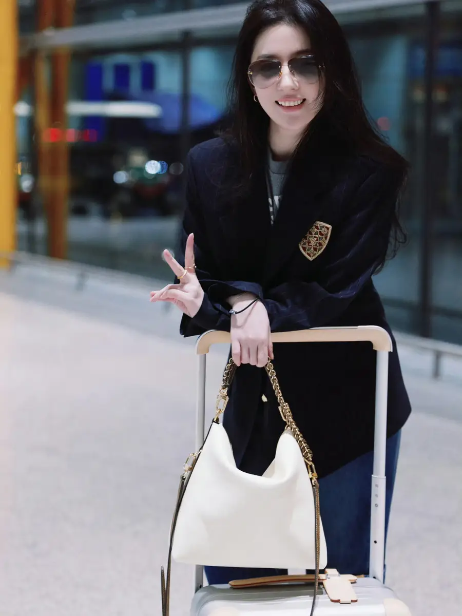 刘亦菲穿藏青西装搭牛仔裤随性简约 白包点缀造型清爽迷人