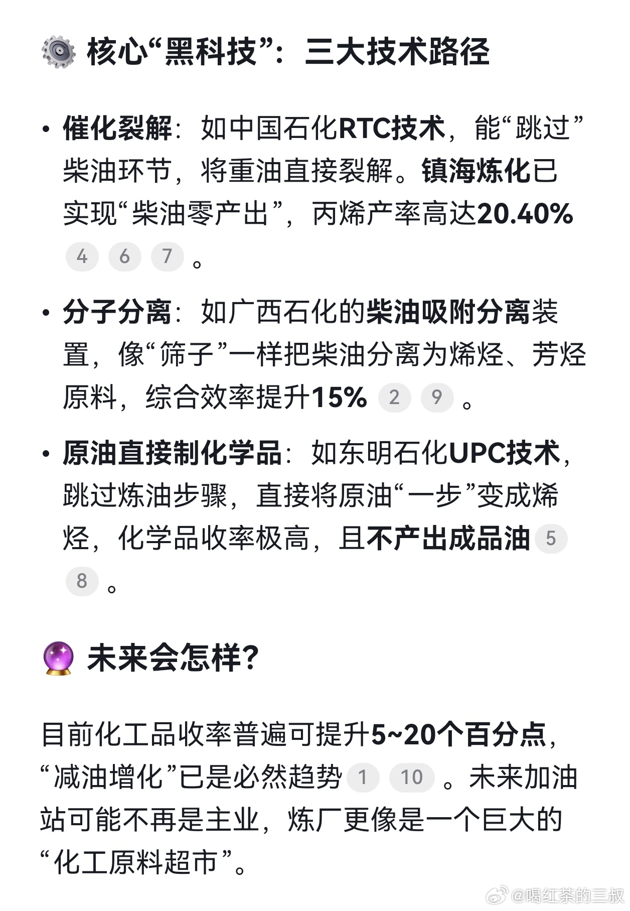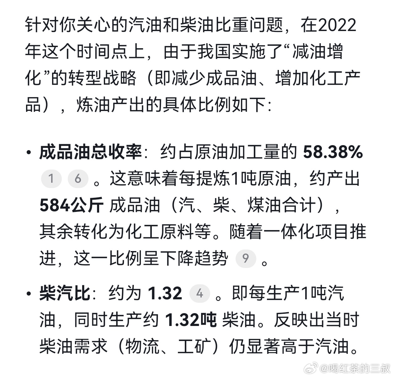 AI在了解常识上,还是用处很大的。22年,我国石油加工量里,58.4%是用于汽油柴油煤油。通过减少汽柴煤油,直接提炼化工产品,是可行的。