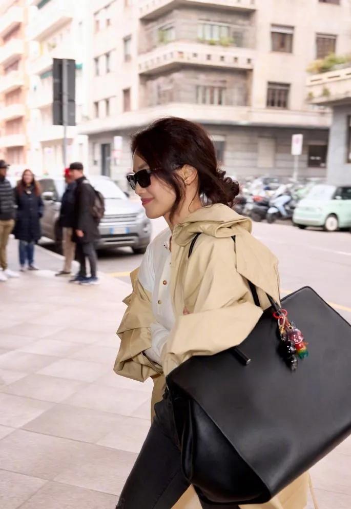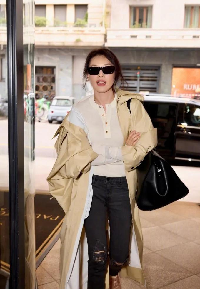 舒淇这气质绝了!✨ 米杏风衣+破洞牛仔裤,随性又高级,这才是教科书级别的穿搭。 舒淇 高级感穿搭