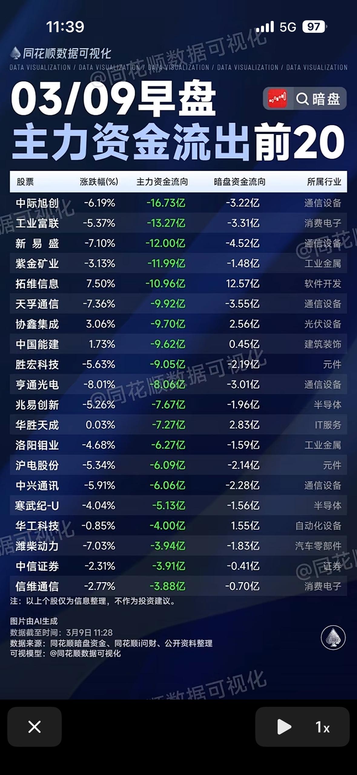 3月9日早盘这主力资金流出情况很值得关注啊! 截至开盘一小时,主力资金流出前20的股票里,中际旭创流出15.27亿元,紫金矿业流出13.37亿元,工业富联流出10.87亿元。 再看开盘40分钟的数据,中际旭创流出15.3亿,紫金矿业流出13.7亿。这么大的资金流出,肯定会对股价有影响。像中际旭创,短时间大量资金流出,股价很可能会波动。对于股民来说,得密切关注这些流出资金的股票,说不定就藏着投资机会,也可能是风险预警呢。