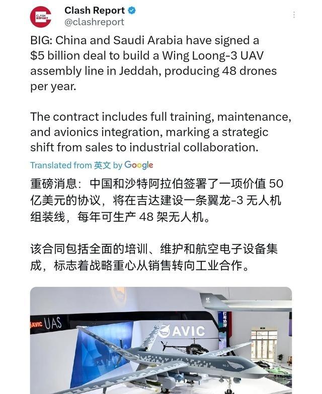 沙特被打醒了!沙特紧急与中国敲定了军工订单!3月7日,根据外媒报道,外媒称,中国和沙特阿拉伯签署了一项价值50亿美元的协议,该协议的核心是中国将在吉达建造一条翼龙-3无人机装配线,每年生产48架无人机。该合同包括完整的培训、维护和航空电子设备集成等等。 穆罕默德·本·萨勒曼1985年出生在利雅得,是国王萨勒曼和第三任妻子生的长子。大学毕业,他就去爸办公室当顾问,帮着处理国家事宜,翻文件,打电话协调。2015年爸当国王后,他升国防大臣,还管经济和发展理事会。那时候他推出一堆改革,搞经济多样化,少靠石油吃饭。2017年他当上王储,管外交、安全和经济大权。 2008年他娶了萨拉·宾特·马舒尔,两人有五个孩子,四个儿子一个闺女。婚礼在利雅得办,挺热闹。他主导的愿景2030计划,重点是技术转移和本地工业,目标是摆脱石油依赖,拉外资,训本地人手。这些改革让他在国内国外都挺有影响力,但也招来争议,比如反腐行动抓了不少王子和商人,关在酒店里审问,收了上千亿罚款。2018年记者卡舒吉事件让他国际形象受损,美国国会还想制裁他,不过他照样推进改革。 2022年他当首相,继续抓经济转型,石油价格波动让他更急着多元化。沙特经济现在石油占大头,但愿景2030想把非石油出口翻倍,旅游和服务业拉起来。他推动女性开车,办音乐节,吸引年轻人支持,但传统势力不满。国防上,他加强军工本地化,早年买美国F-15战机,但近年转买中国货,主要是美国卖东西附加条件多,不给技术。他和美国关系复杂,拜登上台后冷落他一阵,但后来石油危机又拉近。和伊朗关系缓和,通过中国调解,恢复外交,这让他外交上多点灵活。总之,他这人野心大,动作快,沙特变化大半归他。 中东战事乱哄哄,沙特安全压力山大,胡塞导弹袭击让边境城市警报拉个不停。国防总部那些官员天天开会,研究怎么加强空中侦察。军事工业总局头头看中了中国翼龙-3,这玩意远程打击牛,航时长。北京航空工业集团的人带技术资料飞吉达,双方团队见面谈细节。沙特工程师问维护的事,中国专家讲电子系统怎么接。谈了好几天,改条款,调内容。 3月7日外媒爆料,协议签了,50亿刀。中国在吉达建生产线,年产48架。合同包培训,沙特人学操作;维护有零件供应;航空电子集成保兼容。沙特这么选,是因为本土国防急需,从买成品变要技术。早年沙特买中国翼龙系列,2016年签合同买 pterodactyl,就是翼龙,增强边境监控。2017年买翼龙II,大单子,中国出口最大那笔。2022年沙特公司和中电科合资,叫Aerial Solutions,建研发中心,造各种无人机。2024年SERB公司和AVIC谈翼龙3技术转移。现在这个50亿单子,是升级版,不光买,还本地组装。翼龙3性能强,载重2吨,航程远,能挂导弹,适合中东地形。沙特对美国不满,美国卖整机,不给技术,还绑政治条件。比如买F-35,得答应不打也门。 沙特想独立,买中国货多样化来源。中国无人机出口中东多,CH-4卖给好几国,包括沙特。世界防务展上,中国展翼龙X,反潜型,吸引眼球。中东无人机市场大,美国占半壁,但中国份额涨。沙特这个单子,标志转向工业合作,从买买买变造造造,提升自主性。协议细节全,培训让沙特人上手快,维护保长期用,集成让和新系统接上。胡塞袭击让沙特醒悟,得自强。 签完协议,吉达港口设备到货,建厂动工。地基铺好,钢架搭起,电线接上。生产线成型,测试机器人臂。沙特办培训,工程师学原理,组框架,查稳定。首批无人机组装,装传感器,测平衡。中东事态紧,伊朗那边事多,沙特快部署,边境巡逻用上。合作让国防自给,本地制造比例升,少靠单一供货。美国以往只卖成品,不分享技术,条件多,这使得沙特寻找别家。外交上,沙特空间大,谈判有底。军事工业总局签更多协议,导弹和电子战本地化率升高。穆罕默德·本·萨勒曼管项目,查进度,优流程。2026年防务展,中国秀反潜无人机,沙特兴趣大。中国中东市场大,翼龙和CH系列卖好。沙特想建世界大防务产业,签中美单子,本地造。减少石油依赖,军工拉经济。胡塞事让沙特警醒,技术转移关键。协议后,生产48架,培训维护齐全。 沙特买中国货,信号是美国保证不够。整合系统难,但沙特照买,战略移。国防开支大,军工本地化目标高。穆罕默德继续推改革,推动国家现代化。