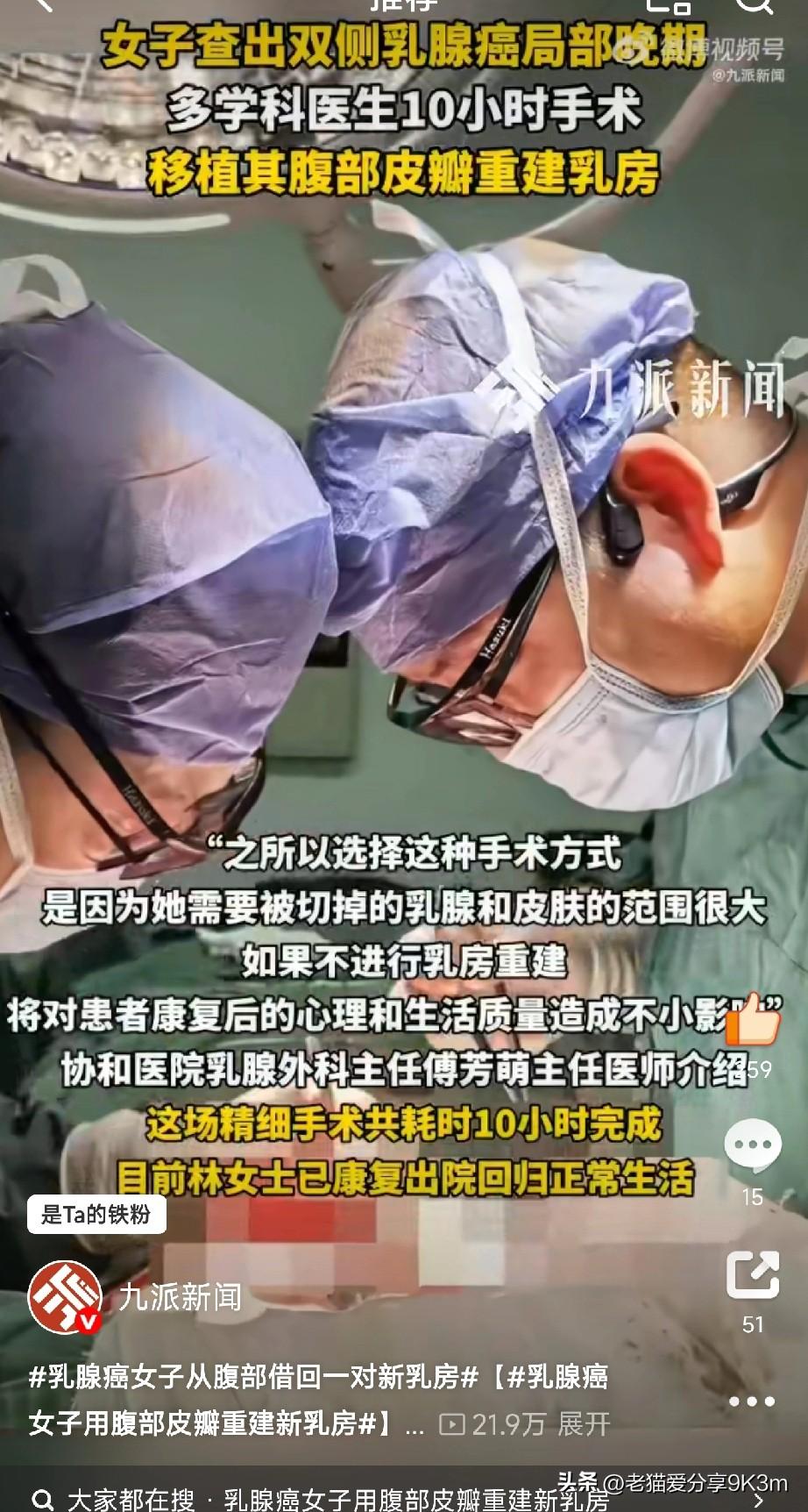 乳腺癌女子重获“新生乳房”:从腹部“借”回一对 福建的林女士确诊双侧乳腺癌,局部晚期,命悬一线。但医生用了一项“神级”技术——从她的腹部“借”肉重塑乳房,10小时手术后,她不仅活了下来,还拥有了和以前一样的新乳房! 半年前,林女士乳房发胀、皮肤像橘子皮,确诊乳腺癌后,她先接受了化疗+靶向治疗。等到手术时,乳腺外科主任傅芳萌团队为她量身定制方案:用“腹壁下动脉穿支皮瓣(DIEP)”技术,把腹部的皮肤、脂肪连同血管一起“搬”到胸前,重建乳房!傅主任说:“她乳腺病变范围大,皮肤水肿没法留,不重建的话,未来心理阴影会很大。我们希望她不仅活着,还要活得有尊严!” 手术耗时10小时,精细得像“绣花”!现在林女士康复出院,重新拥抱生活。想想以前,很多人觉得乳腺癌晚期能活命就不错了,胸前残缺是“代价”。但现在医学真的太牛了——不仅能救命,还能让身体“完整”! 评论区有位大姐的故事更让人破防:“我50多年前乳腺癌手术,命保住了,但胸部一侧没了,夏天穿衣服都歪着,心里一直有疙瘩。” 对比林女士,真的感慨:医学进步给了患者第二次生命,甚至更好的生活! 乳腺癌治疗现在有多强? 局部晚期也能治! 先化疗缩小肿瘤,再手术清除,生存率大大提升! 乳房重建不是梦! DIEP技术用自身组织重建,自然柔软,不留异物感。 保命更保尊严! 医生不仅救身体,更在救心灵,让患者重拾自信。 相信医学! 技术日新月异,曾经的“绝路”现在可能有希望! (文章素材来自九派新闻,侵删)