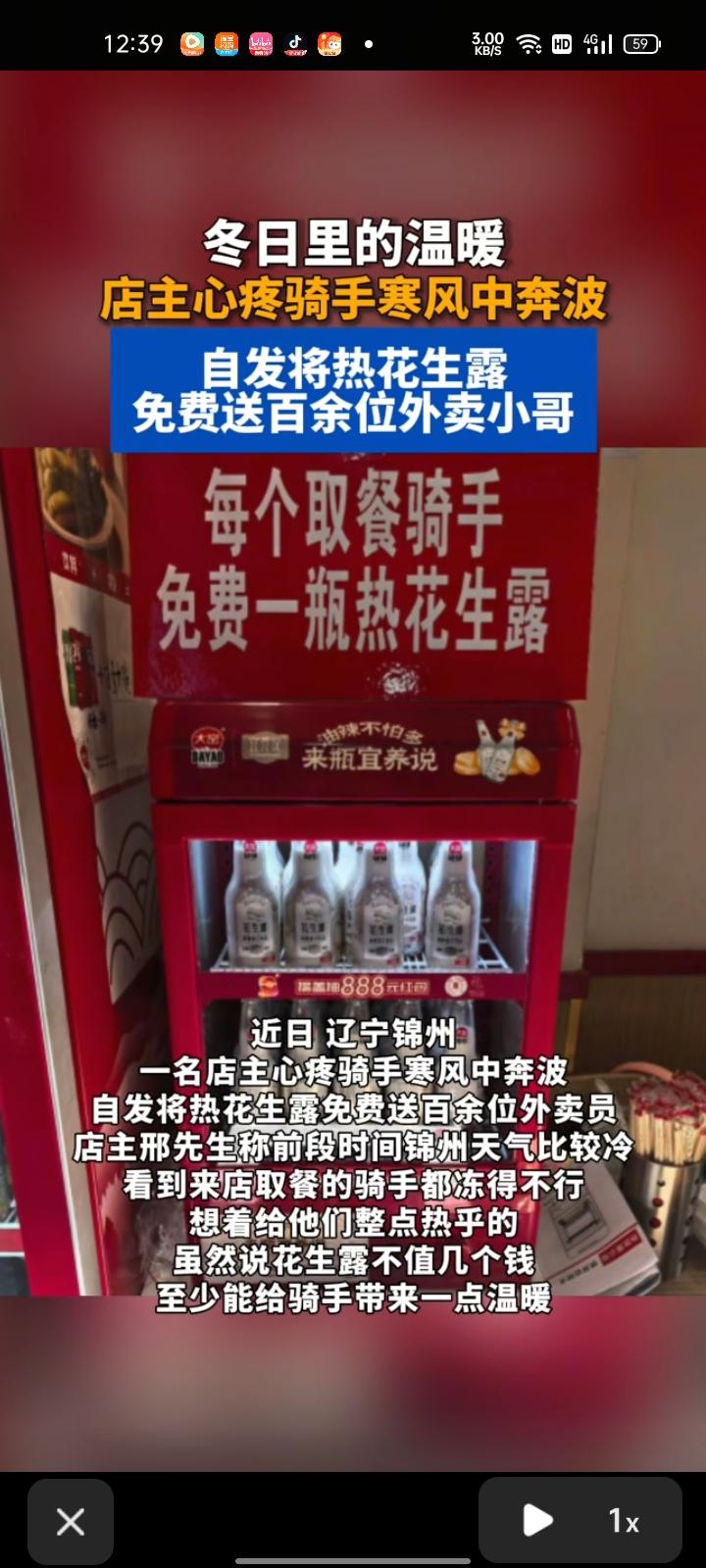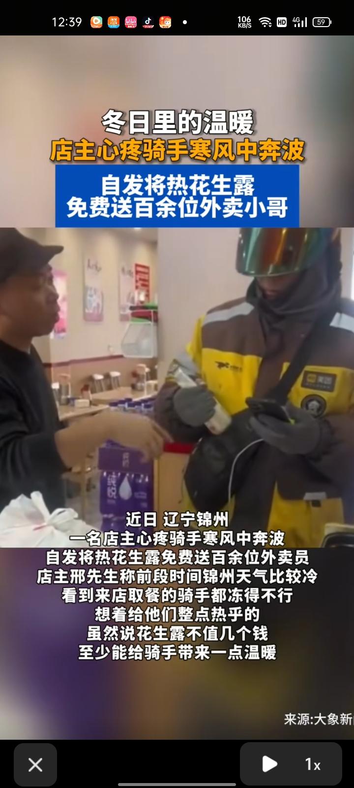 3月7日,辽宁锦州。当天天气很冷,来店取餐的骑手都冻的不行,店主自发将热花生露免费送给外卖小哥。店主邢先生表示,虽然花生露不值几个钱,至少能给我骑手带来一丝温暖。 店主送出的不只是饮品,更是对平凡劳动者的尊重与心疼。 人间烟火气,最抚凡人心,小小的善意,就是寒冬里最实在的温暖。