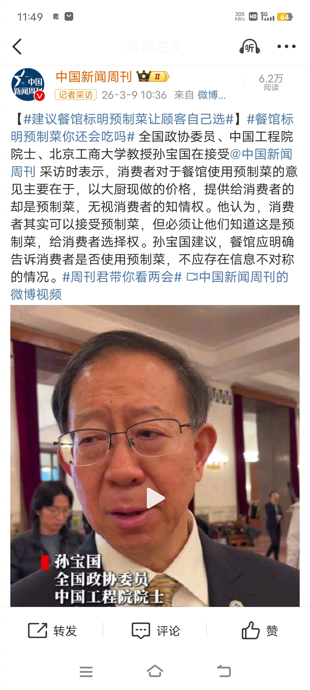 建议餐馆标明预制菜让顾客自己选全国政协委员、中国工程院院士、北京工商大学教授孙宝国在接受采访时表示,消费者对于餐馆使用预制菜的意见主要在于,以大厨现做的价格,提供给消费者的却是预制菜,无视消费者的知情权。他认为,消费者其实可以接受预制菜,但必须让他们知道这是预制菜,给消费者选择权。孙宝国建议,餐馆应明确告诉消费者是否使用预制菜,不应存在信息不对称的情况。两会观察团