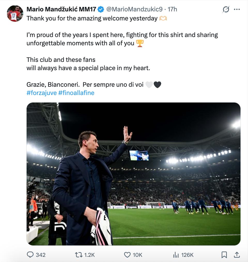 曼朱基奇更新:感谢大家昨天的热情欢迎 我为这些年在这里度过的时光、为这件球衣的奋斗,以及与你们所有人分享的难忘时刻而感到自豪 尤文图斯和尤文球迷永远在我心中占据着特殊的位置 谢谢你们,斑马军团,我永远是你们的一员 (曼朱基奇上一次更推,还是2024年6月)曼朱基奇更新:感谢大家昨天的热情欢迎 曼朱基奇