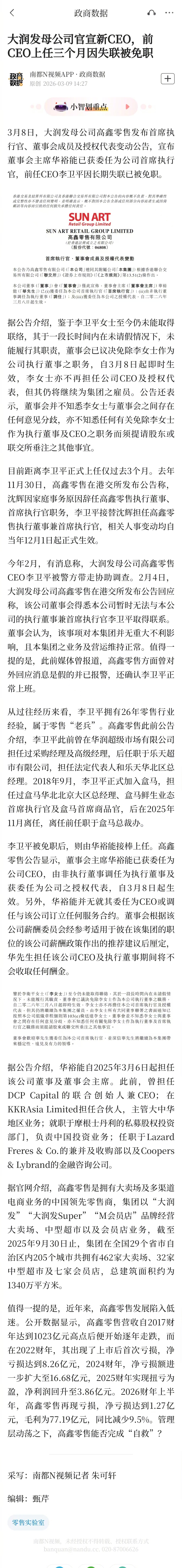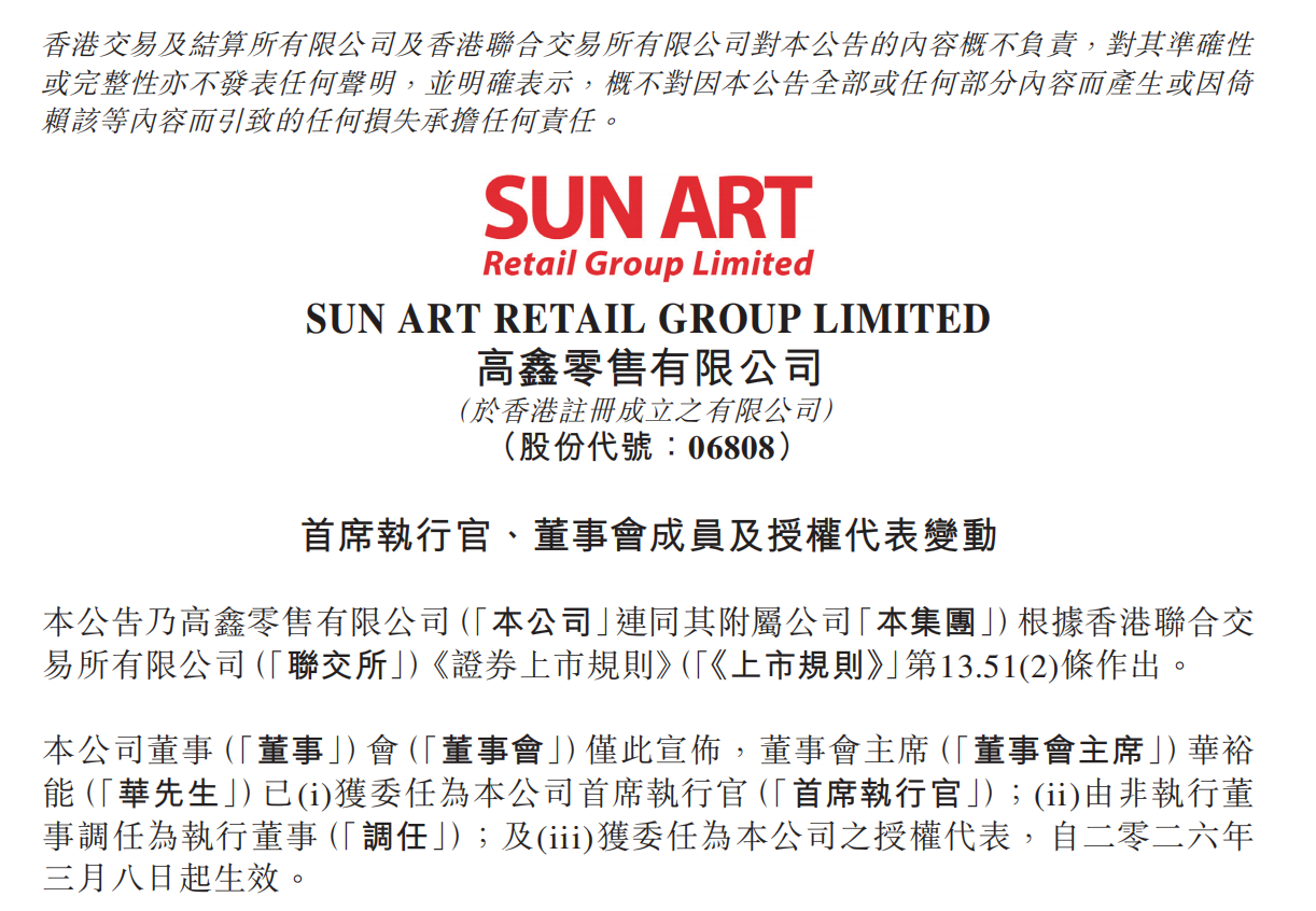 #大润发母公司新CEO上任#【#大润发母公司官宣新CEO#,前CEO上任三个月因失联被免职】3月8日,大润发母公司高鑫零售发布首席执行官、董事会成员及授权代表变动公告,宣布董事会主席华裕能已获委任为公司首席执行官,前任CEO李卫平因长期失联已被免职。