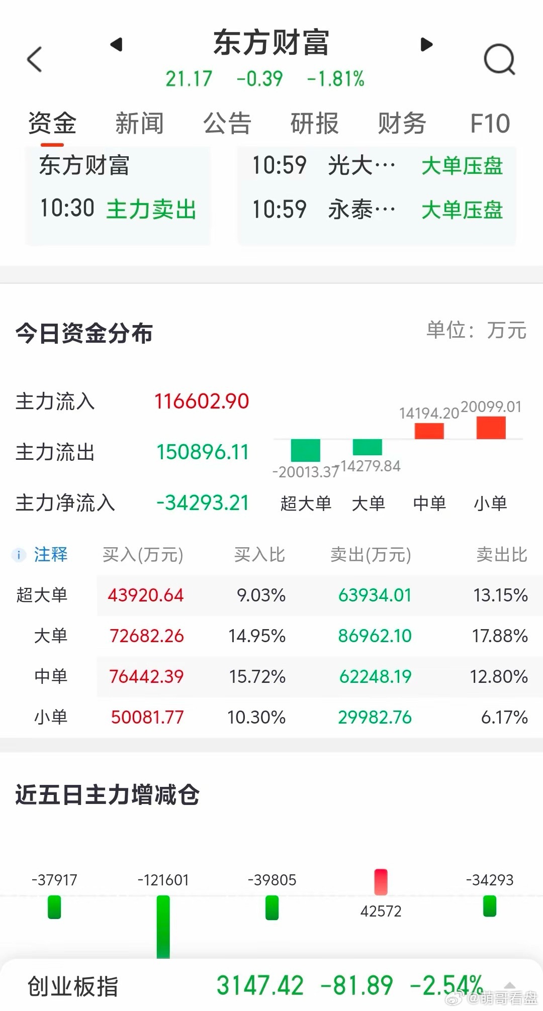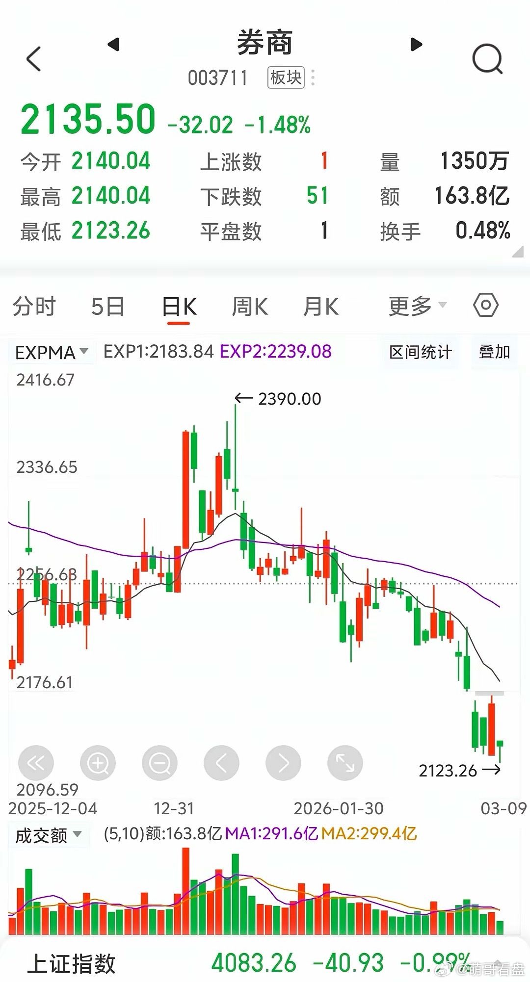 券商!券商!这就是券商!今天3月9日星期一,今天全球股市继续受中东地区军事冲突的影响,亚太股市受重挫。A股市场三大指数均低开。截止目前,牛市旗手券商板块下跌1.48%,板块个股仅一家红盘。券茅东方财富300059以每股21.15开盘,低开1.90%。开盘至目前,都在此位上下窄幅震荡,目前换手率0.86%,成交金额为24.39亿元。主力资金净卖出3.42亿元。今天的走势,上周五我就明确个人观点。低换手率,低成交金额的上涨,难有动力促进后面上涨。券商板块今天早上盘中再创新低,券商一哥中信证券与券茅东方财富双双下跌。板块目前根本无领头个股,又怎么可能真正的上涨呢!个人观点不喜勿喷