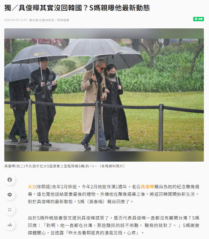 【S妈去墓园看大S了】S妈说具俊晔一直在台湾没离开 3月8日,S妈黄春梅在社交平台晒出了大S雕像的照片:“亲爱的宝贝:台北天气不错,妈妈来金宝山看你,一上山,却一片凄风苦雨,妈妈心中也苦不堪言!幸而有很多爱你的粉丝依然来送花、看你。宝贝:阿德(儿子)感冒了一样按时做早餐陪你吃,我很感谢他。宝贝:我会盯着孩子健康、平安成长的,爱你。”另据台湾联合报,有媒体问S妈具俊晔是否一直都没有离开台湾,S妈回应:“对啊,他一直都在台湾,那些酸民的话不用听,听我的就对了。”