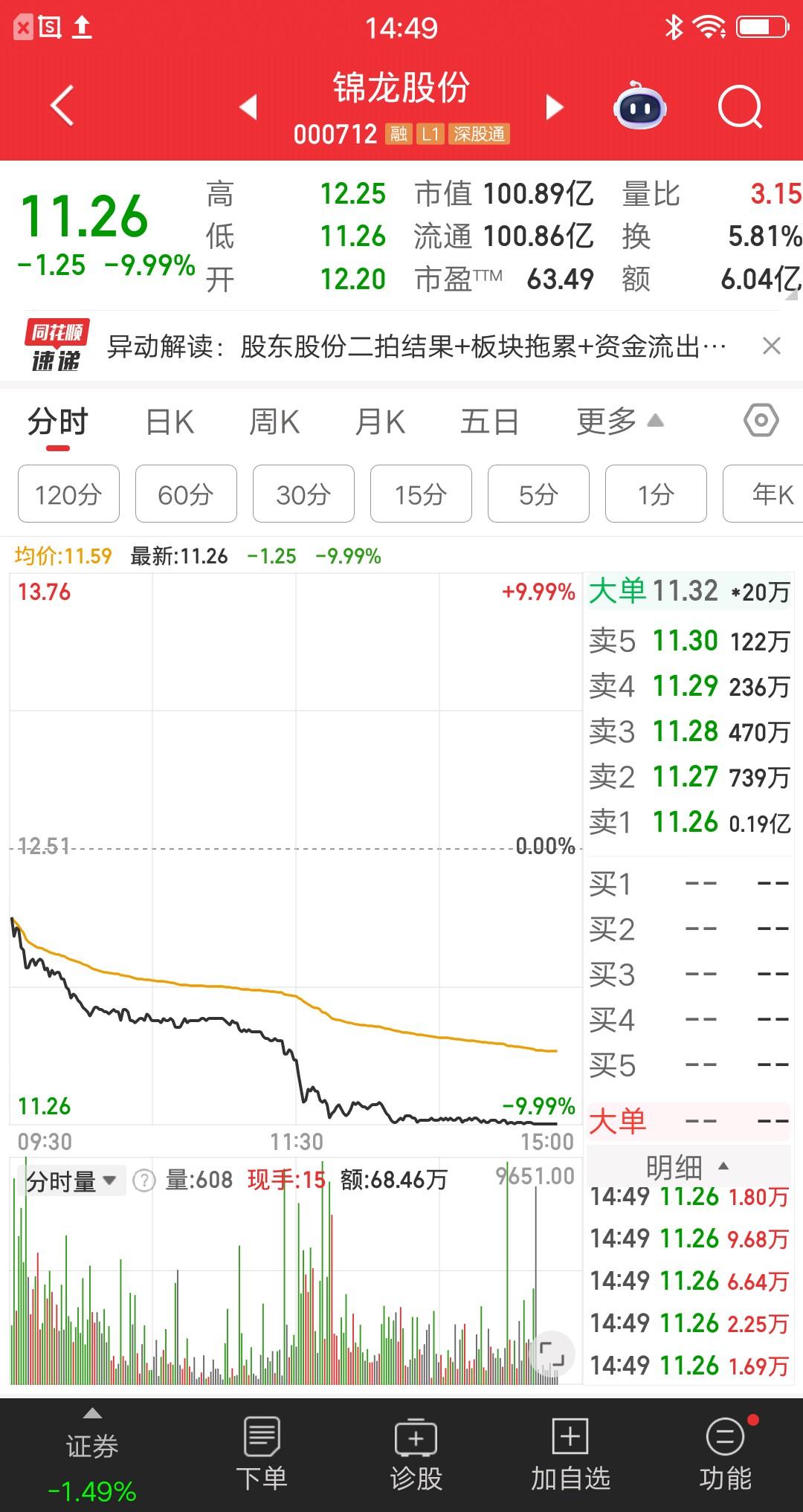 券商板块今天最惨的票诞生了,股价按死跌停,也是板块唯一的跌停股。今天证券跌幅1.49%,表现相当弱势,大盘不好也不护盘,反而放量下跌。锦龙股份竞价低开2.48%,开盘后持续杀跌,全天毫无抵抗,尾盘封死跌停。全天成交6亿,板上还有0.15亿。 消息面上,公司6300万股司法拍卖,成交了5250万股,另有1050万股流拍。拍卖的价格为9.9元每股,跌停前股价为12.51元,折价20%多。 另外,证券调整时间很久了,很多资金的耐心耗干了,再加上利空,资金砸盘宣泄情绪。