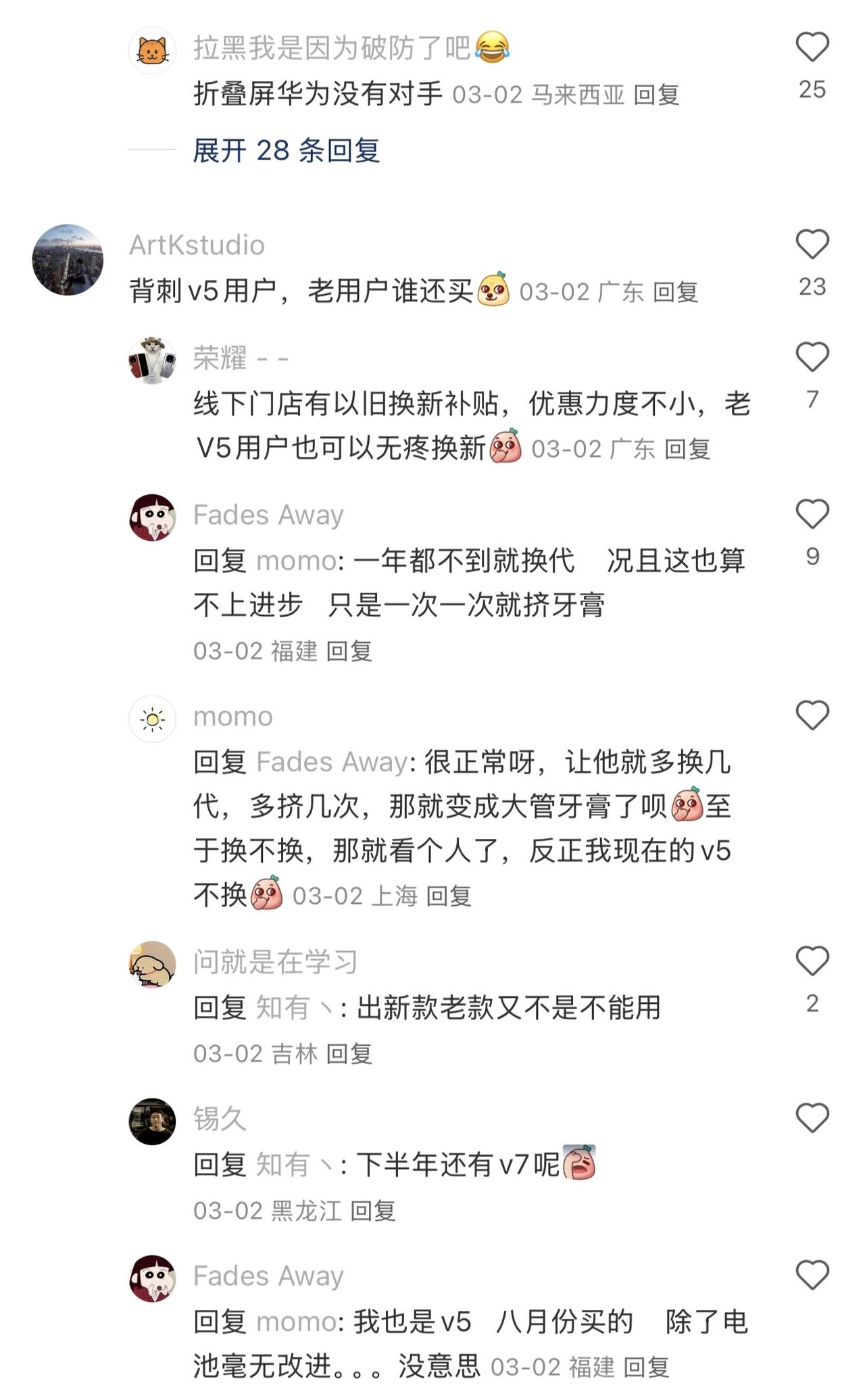 荣耀Magic V6真机看了一下,内屏的黑边有点宽,折叠屏平整度不错,电池是6850毫安时,只有1TB版本才是7150毫安时。 后置相机几乎没升级,并没有传说中的2亿像素主摄,超广角镜头光圈还小了点(f/2.2),长焦大概率还是OV64B(荣耀到底还有多少库存?),海外发布会上说防抖增强到CIPA 6.5。 由于与上代Magic V5的推出只相隔8个月,加上可能涨价千元,年底或许还有Magic V7,部分网友认为“背刺”,不推荐升级。荣耀Magic V6