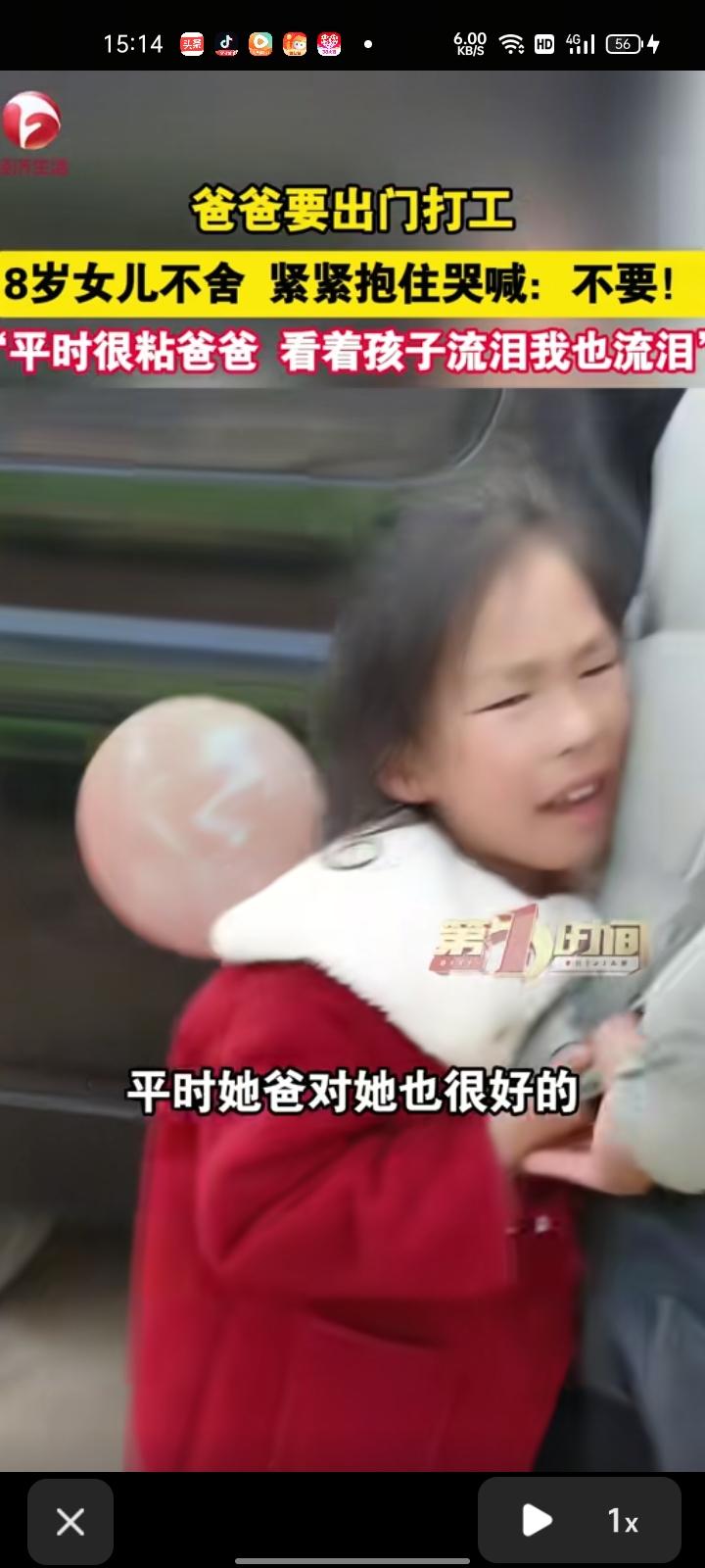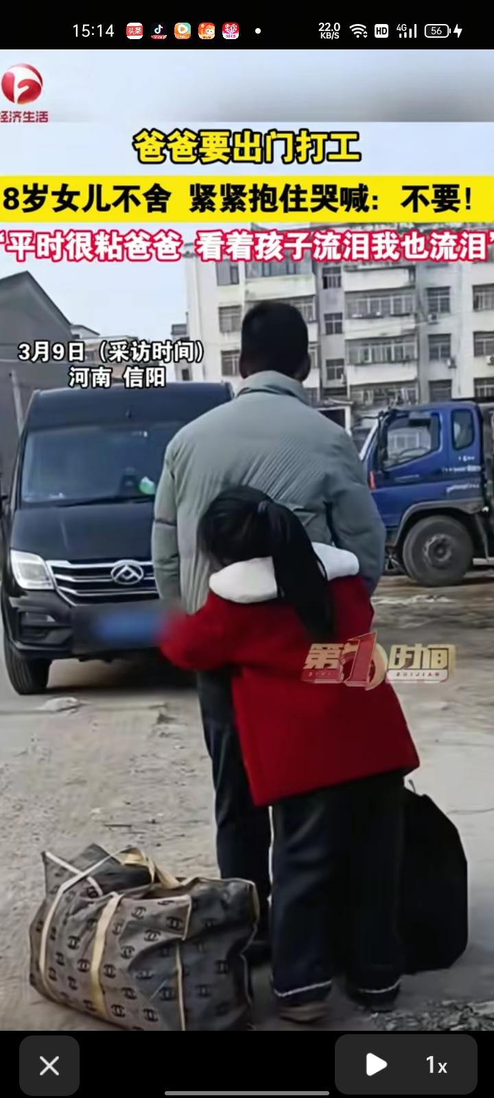 3月8日,信阳市淮滨县。孩子妈妈发布一段视频,孩子爸爸带着行李出门打工,八岁女儿心里不舍,紧紧抱住他哭喊“不要”。看到小孩流泪,自己也流泪了,平时孩子爸爸对她挺好的,家里有三个孩子,为了生活没办法。