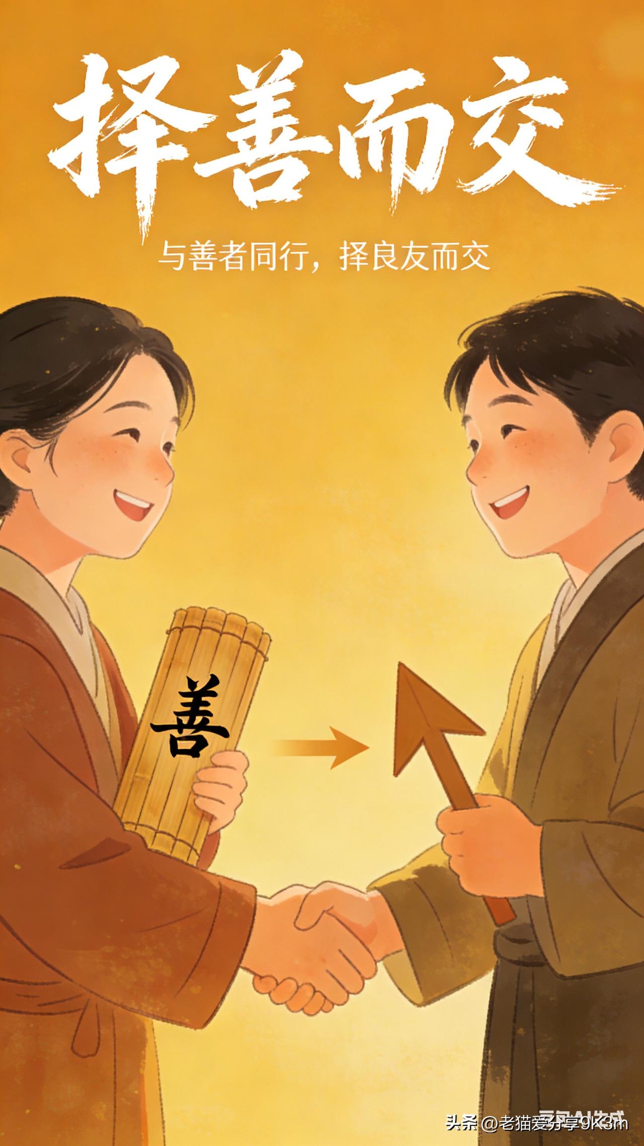 择善而交 抖音有个段子扎心了:“当你发现身边的人跟你反目,不是因为他变了,而是他把面具拿下来了。” 这话细品太对!今天必须唠唠“择善而交”的狠学问——别因为谁对你好就当朋友,要看他骨子里善不善良! 为啥要“择善而交”? 不是他变了,是本色暴露了:你以为的“朋友”可能只是戴了面具。等你没用了、有矛盾了,面具一摘,原形毕露,伤你最深。 善良是底线,不是“对你好”:有人对你好可能只是利益交换,但善良的人,就算不跟你亲近,也不会主动伤害你。人品差的人,对谁都没真心! 交朋友别被“对你好”蒙蔽:对你好可能是手段! 要看他的日常为人:对服务员凶不凶?对弱势群体有没有同理心?对家人朋友是不是两面派? 观察细节比听承诺重要:承诺可以编,但行为藏不住。比如:借钱后还钱的态度、约好的时间守不守时、背后怎么议论别人。 远离消耗你的人:总贬低你、抱怨负能量、占你便宜没够的——赶紧跑!你的能量会被吸光! 择善而交=保护自己的人生 善良的人就像暖阳,不灼伤你,但给你温暖。交朋友不是看谁“对我好”,而是看他骨子里是不是个好人。 他对服务员的态度,就是未来对你的态度;他对陌生人的善良,才是真实的品格底色。 (图片由ai生成)