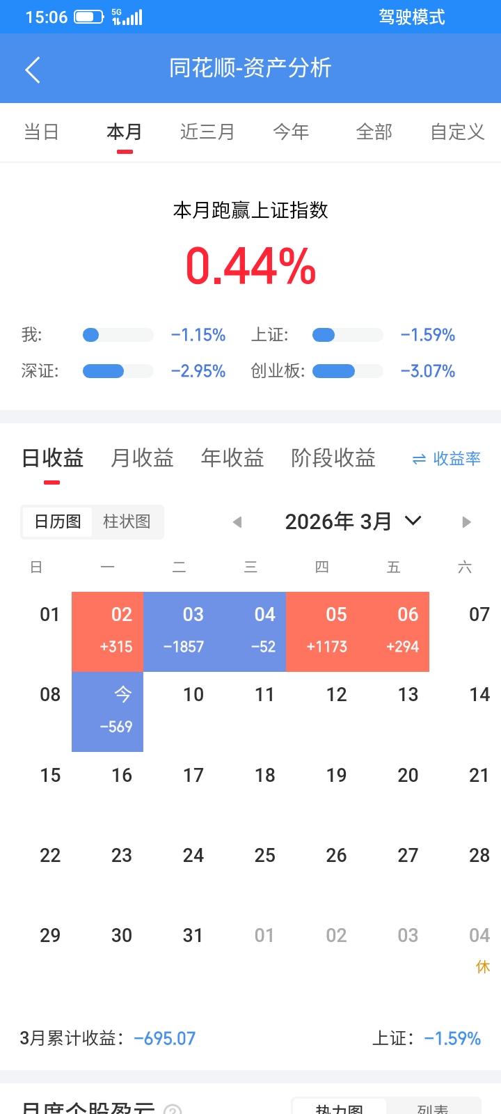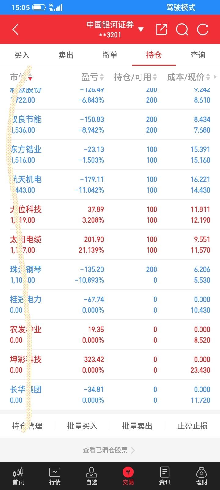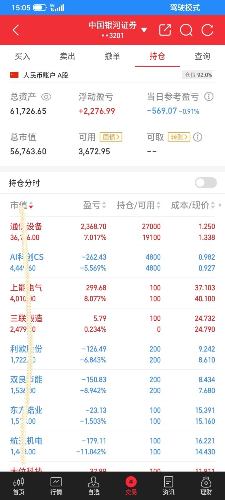 2026.03.09,今天股市又是恐慌性大跌,但是收盘又拉起来一些,又是上演老乡别走的把戏,砸下去,怕大家都清仓跑路了,又拉起来,让我止损了又高价买回来,低价卖高价买,跌宕起伏,从最多的时候亏了2千多,到收盘回来一些,还是亏了将近600块。 今天太阳又涨停了,还好上周五没有被洗出来,今天封板也没有开板,就继续持有,明天下跌再卖。 桂冠低开冲高回落,下跌中触发了止损条件单,自动以10.37清仓止损卖掉100股,亏了60多块钱,亏钱了不甘心,明天反弹再重新买回来吧。 农发高开,冲高回落,可能冲高诱多,还好没有追涨,下跌中触发了回落卖出条件单,自动以8.59自动卖掉100股,赚到18块钱,赚钱了卖出了就算了,浮盈一场,空欢喜。这不是我的菜,换别的了吧。 今天上能反弹上涨,收阳线,继续持有。 持有到利欧,航天,收假阳线,下跌了一点点,假阳线也是阳线,可能恐慌已经过去了,还是继续持有,收阴线再卖。 今天大位强势上涨,差1毛钱没有涨停,又跌下来了,可能是下跌洗盘,还是收大阳线,继续持有,下跌再卖。 今天坤彩上涨势头减弱了,低开低走,收阴线,为了安全,见好就收,收阴线,阴线卖出,收盘以23.43元清仓卖掉100股,赚323元,减掉上一次亏的80多块钱,这只股票还是赚240块钱。 长华又是低开低走,买错了,收阴线,还是卖出,收盘以11.72卖掉100股,又多亏了36块钱。亏钱了不甘心,明天反弹再买回来。 锆业今天勉强翻红,收阳线,继续持有。 钢琴又买错了,今天低开低走,大幅下跌,逼近跌停,下跌中触发了止损单,自动以5.40清仓卖掉300股,又不甘心,没有跌停,还反弹了,反弹中以5.51元买回来200股,明天反弹再补仓吧,又是低卖高买,多亏了20多块钱。 今天新建仓一只股票,反弹中以24.73元买入100股三联,收盘浮盈几块钱。 科创etf继续下跌,触底反弹。继续持有。 通信设备etf大幅低开,怕低开高走,踏空了,于是放弃规则,开盘以1.340买入500股,还是买错了,成交之后不断下跌,下跌中以1.292元再补仓买入4700股,成交之后下跌了一点点就触底反弹了,反弹了浮盈100多块钱,放弃这点小钱,就当补仓,不卖,收盘还下跌了0.039元,但是没有钱买了,就以1.338元买入2700股。今天一共买入了7900股,etf的仓位更重了,贪心一点,今后下跌再继续买入,反弹上涨就卖出,一共持有2.7万股通信设备etf了。赌一把大的。亏了也认了。 今天总体股票没有亏多少钱,亏损的全部是etf,这是计划中的亏损,下跌可以更低的价格补仓,上涨可以走得更远,下跌继续买入,总是会上涨的。 今天没有钱了,网上贷了1万元,利息1天6.5元,不是很多,风险不大。今天总市值5.67万元,总资产6.17万元,贷款1万元,今天总体账户亏损569元。希望明天反弹上涨吧。