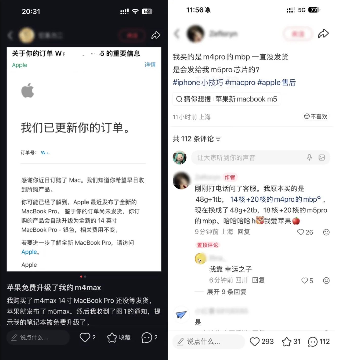 苹果这么良心?下单的是 M4,因为没发货的同时出新款了,自动升级成 M5,还增配了 1TB ...