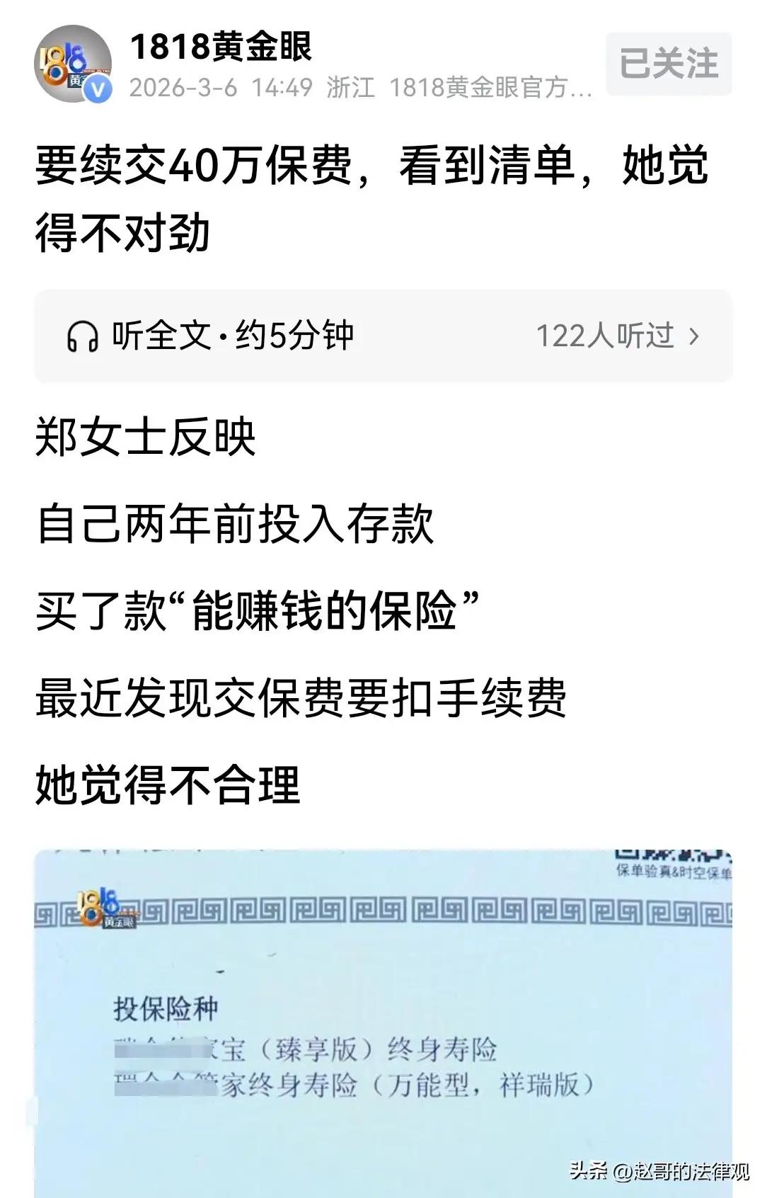 4040元“买”来的糊涂账:当“复利3.5%”遇上“天书”合同 今儿咱们单说一桩发生在杭州的“理财惊魂记”。这事儿听着像是“钱生钱”的美梦,实则是一场让人“雾里看花”的闹心局。话说一女子,被那“复利3.5%”的诱人承诺迷了眼,豪掷200万,买了两份终身寿险。前两年,她还像个“老黄牛”一样,屁颠屁颠跑去营业厅交钱,觉得这钱存得踏实。谁曾想,到了第三年,这“自动扣费”竟扣出个“程咬金”——凭空多出4040元的“抵交手续费”! 这一下,真是“当头棒喝”。女子懵了,心想:我自己的钱,转个账交个费,怎么还要收“过路费”?这岂不是“肉烂在了锅里”还要收锅钱?她赶紧去找保险公司理论,谁料对方三个人接待,个个都说不清楚,最后只甩出一句冷冰冰的“合同约定”。女子翻遍那本像“天书”一样的合同,压根没找到“交保费还要扣1%手续费”的白纸黑字。这下,她算是明白了,自己这是掉进了“文字游戏”的坑里,真是“哑巴吃黄连,有苦说不出”。 但这“4040元”的纠纷,藏着的正是咱们今天要说的“大健康”意识。真正的健康,讲究“内外双调”。外在,咱们得把这身体照顾好,别动不动就“气大伤身”;内在,更要有一颗“明辨是非”的心。投资理财,切忌被那“高收益”迷了心智,得擦亮眼睛,把那合同条款“嚼烂了、咽肚里”。同时,咱们也得学会“感恩”这社会的“不完美”,是它一次次教会我们“吃一堑,长一智”,让我们在跌跌撞撞中学会保护自己。 我们要感恩这次“花钱买教训”,是它让我们明白,真正的安全感,不是来自冰冷的合同,而是来自清醒的头脑和理性的判断。 愿世间少一些“糊涂账”,多一些“明白人”。 愿你我皆安康,前程皆似锦!