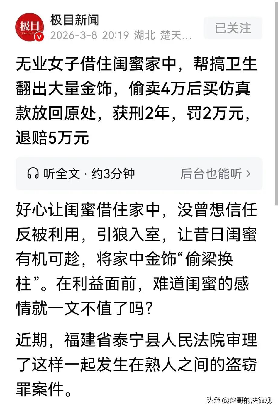 金玉其外,败絮其中:当“闺蜜”成了健康的“头号公敌” 今儿咱们单说一桩发生在福建泰宁的“宅门悲喜剧”。这事儿听着像是古装剧里的“狸猫换太子”,实则是现实版的“农夫与蛇”。话说一女子,心地良善,见闺蜜失业欠债、流离失所,便仗义援手,将其迎入家中借住。谁曾想,这“引狼入室”的典故不是说着玩的。这闺蜜,住着主人的房,吃着主人的粮,心里盘算的却是如何“偷梁换柱”。她趁主人不备,将那抽屉里沉甸甸的黄金首饰席卷一空,临了还买了仿真款放回原处,真是“做贼做到家”,把主人的智商按在地上摩擦。 事发之后,女子悔不当初,那一句“我当你是好姐妹,你惦记的是我的黄金”,真是道尽了天下“老好人”的心酸与无奈。这哪里是闺蜜,分明是披着羊皮的“黄金大盗”! 但这“偷金”闹剧的背后,藏着的正是咱们今天要说的“大健康”意识。真正的健康,讲究“内外双调”。外在,咱们得把那门窗锁好,贵重物品妥善保管,别给“贼心”留缝隙;内在,更要修一颗“明辨是非”的心。古人云:“防人之心不可无。”太过轻信,往往是因为自己“心太软,肉太疼”。这种因轻信而导致的“精神内耗”,比那丢失的黄金更伤身。我们要学会“感恩”生活中的每一次“打脸”,是它教会我们成长,让我们明白,真正的安全感不是来自对他人的盲目信任,而是来自清醒的自我保护。 我们要感恩这次“血淋淋”的教训,是它让我们看清了人性的复杂,从而更加珍视那些真正值得交往的真心朋友。 愿世间少一些“塑料姐妹花”,多一些肝胆相照的真君子。 愿你我皆安康,前程皆似锦!