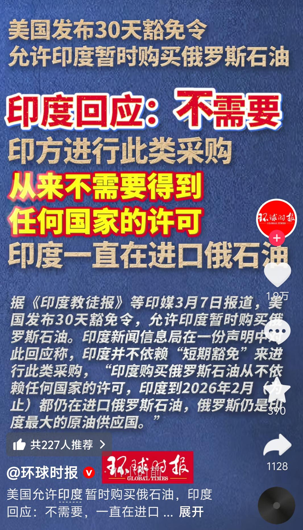 美国霸权失效!印度硬气表态:能源主权,轮不到他国指手画脚 美国抛出30天俄油进口豁免令,本想以“施舍者”姿态拿捏印度,不料惨遭当面回绝!印度官方强硬表态:购买俄罗斯石油,从不依赖任何国家许可。 中东局势动荡、油价飙升,美国此举实为转嫁压力、稳住自身能源盘。作为全球第三大石油进口国,印度始终将俄油作为核心供应源,根本不吃“先制裁后豁免”的霸权套路。 这波硬刚,不仅戳破美式双标,更宣告单边制裁体系彻底失灵,世界多极化趋势已不可阻挡!