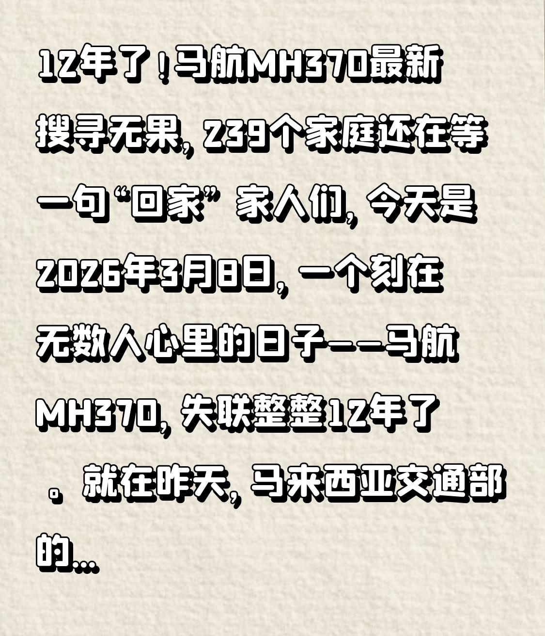 12年了!马航MH370最新搜寻无果,239个家庭还在等一句“回家” 家人们,今天是2026年3月8日,一个刻在无数人心里的日子——马航MH370,失联整整12年了 。就在昨天,马来西亚交通部的通报,再次让全网沉默:新一轮深海搜寻,依旧“没有任何发现”。 12年前的凌晨,这架从吉隆坡飞往北京的波音777,载着239条生命,在雷达上突然消失。其中154名中国同胞,有人要去国外出差,有人盼着回家团聚,还有人带着孩子开启第一次远行。谁也没想到,那一声“晚安,MH370”,竟成了永别。 这12年,我们等来的不是真相,而是一次次满怀希望后的失望。从最初的大规模搜救,到碎片的偶然发现,再到各种猜测满天飞,这起航空史上最大的谜团,始终没有答案。 就在大家以为搜寻会就此停滞时,剧情迎来转折。2025年,马来西亚政府联手“海洋无限”公司,重启搜寻,目标锁定南印度洋1.5万平方公里的新海域,还签下“找不到不收费”的协议,报酬高达7000万美元。 所有人都以为,这次或许能揭开真相。整整28天,水下机器人在漆黑的深海里,一寸寸扫描了7571平方公里的海底,哪怕遇到恶劣天气也没停下 。可最终,还是传来了最扎心的结果:没有发现任何能确认飞机残骸的线索,当前阶段搜寻已于1月23日结束 。 12年,4380个日夜,对于普通人来说,是一轮生肖的轮回;可对于那239个家庭,是望眼欲穿的等待,是永远停在那天的思念。 有人每年这一天,都会给亲人的手机发一条短信:“爸,我想你了”;有人把亲人的照片揣在怀里,走遍天涯海角,只为寻找一丝线索;还有人守着空荡荡的家,始终不肯换手机号,怕孩子万一回来,找不到路。 他们要的从来不是巨额赔偿,只是一个明确的答案:飞机去哪了?亲人还好吗?哪怕只是一片残骸,也是对逝者的告慰,对生者的交代。 如今,搜寻暂时止步,但等待从未停止。马来西亚官方说,会继续向家属通报进展 ;而那些家庭,也依旧在坚守。 这件事告诉我们,生命无常,团圆难得。我们总以为来日方长,却忘了世事难料。趁现在,多陪陪父母,多抱抱爱人,多看看身边的人。 12年,时光流转,岁月变迁,但那份牵挂从未褪色。愿真相早日水落石出,愿239个灵魂能找到归途,愿每一个等待的家庭,都能早日等来那句迟了太久的“我们回家了”。 如果你也为这些家庭揪心,不妨点个赞,让更多人记住MH370,记住那些还在等待的人。
