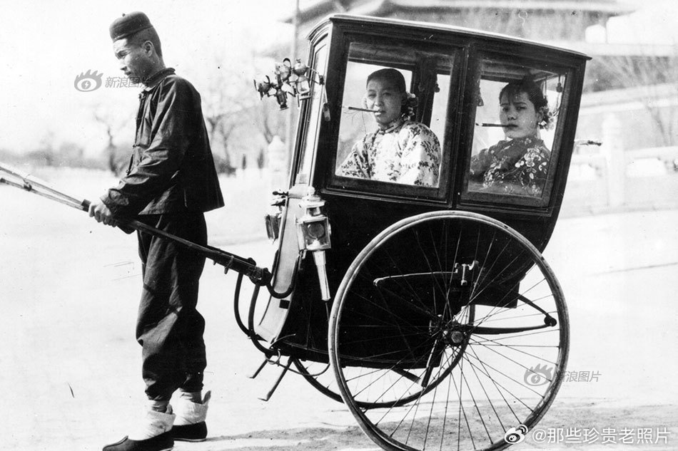 民国时,坐在人力车里叼着烟卷的两个女人,她们头上戴着花,身上还穿着花衣服。