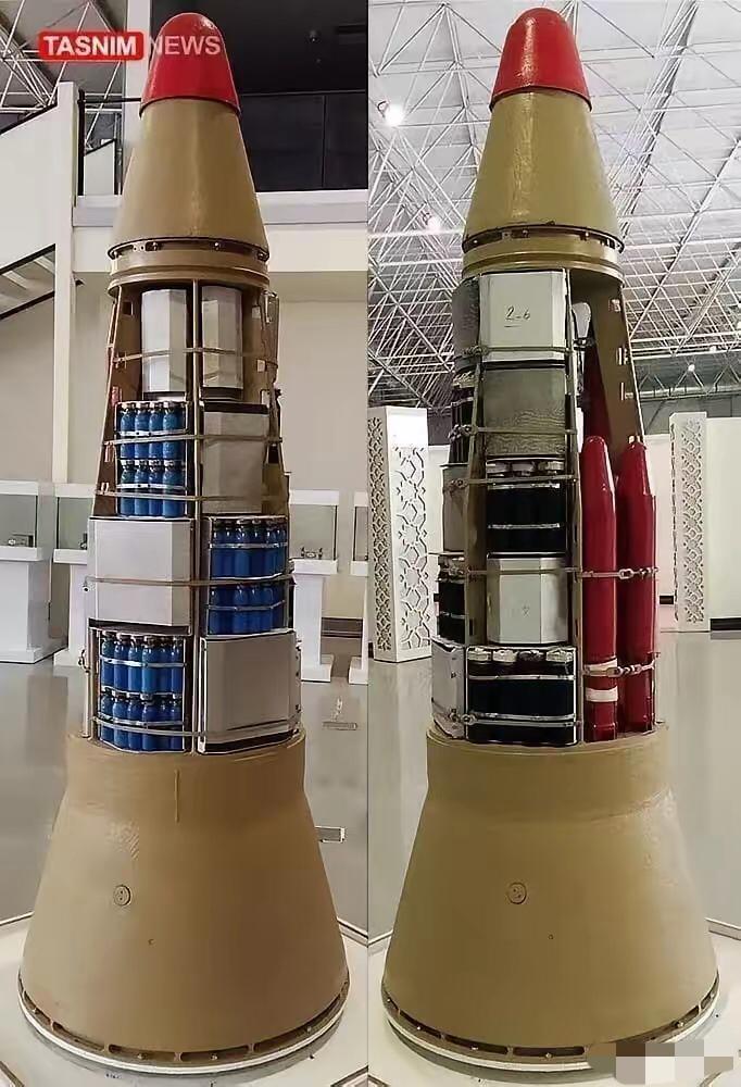 伊朗的先进导弹没多先进。看这个霍拉姆沙赫尔-4型弹道导弹的弹头是不是很山寨?左边的里面有好多密密麻麻的蓝色小圆柱体,一枚导弹可携带约80枚这样的小炸弹,在目标上空7公里左右爆裂抛撒,像天女散花一样覆盖大片区域,适合打机场、兵营这类目标,这个就是集束弹头。右边的里面有两个大红色圆柱体,旁边还有很多黑色小圆柱体,这个就是伊朗式混合多弹头构型,用大弹头打坚固目标,比如地下掩体、指挥中心,用小集束弹做区域压制,基本实现一弹两用,近几天,美以重要目标吃的导弹,挨的炸,主要是这种。