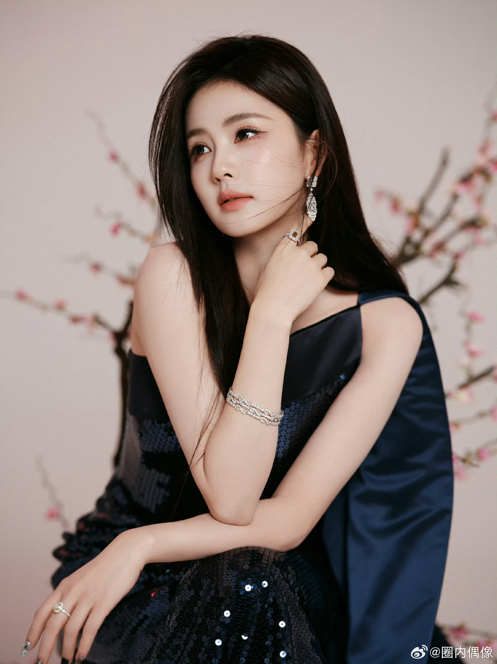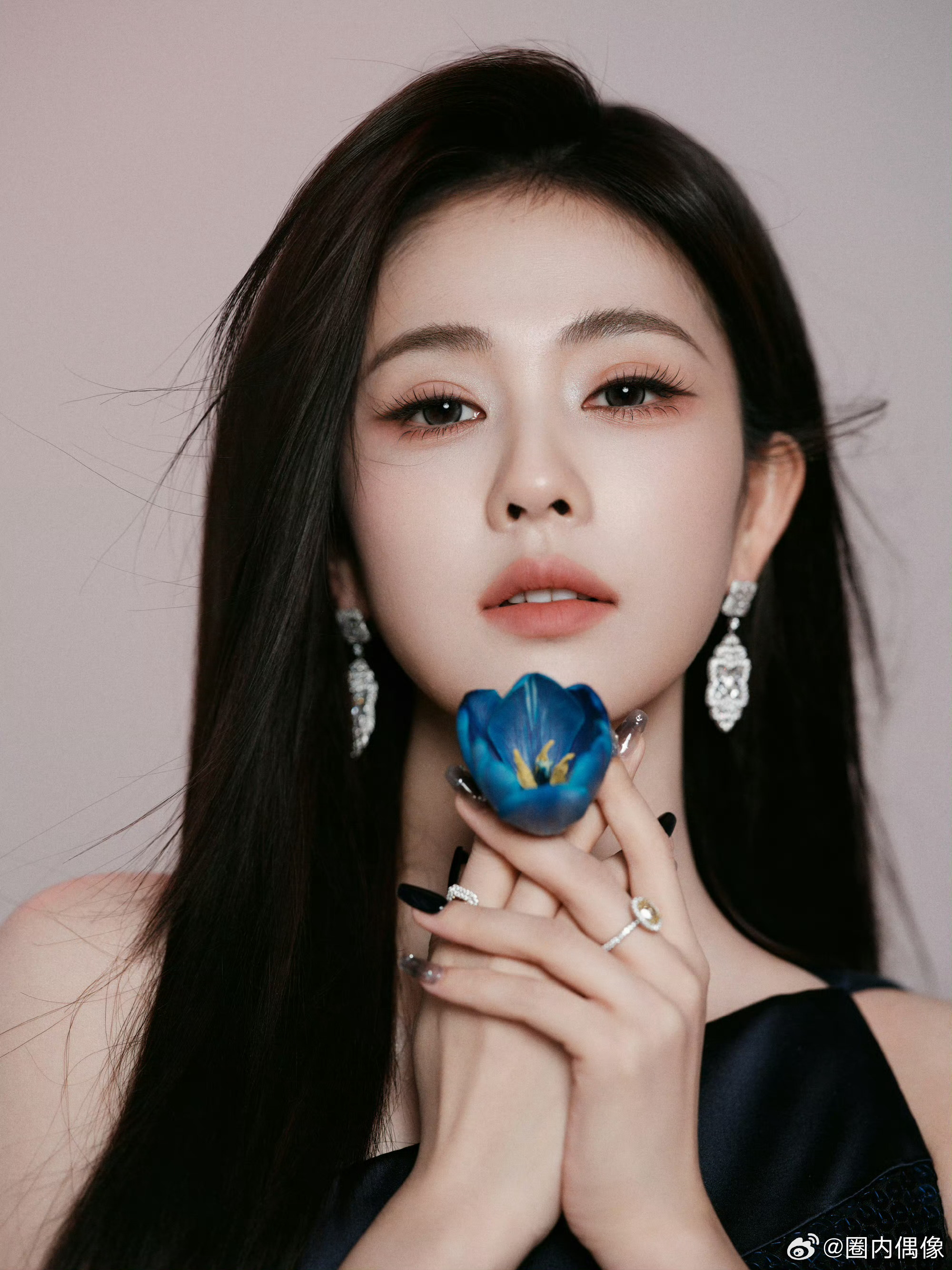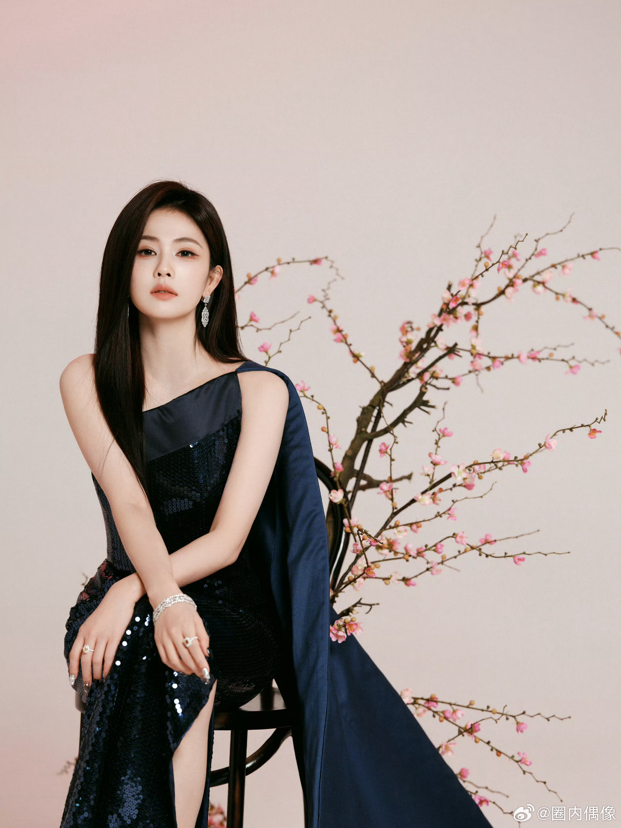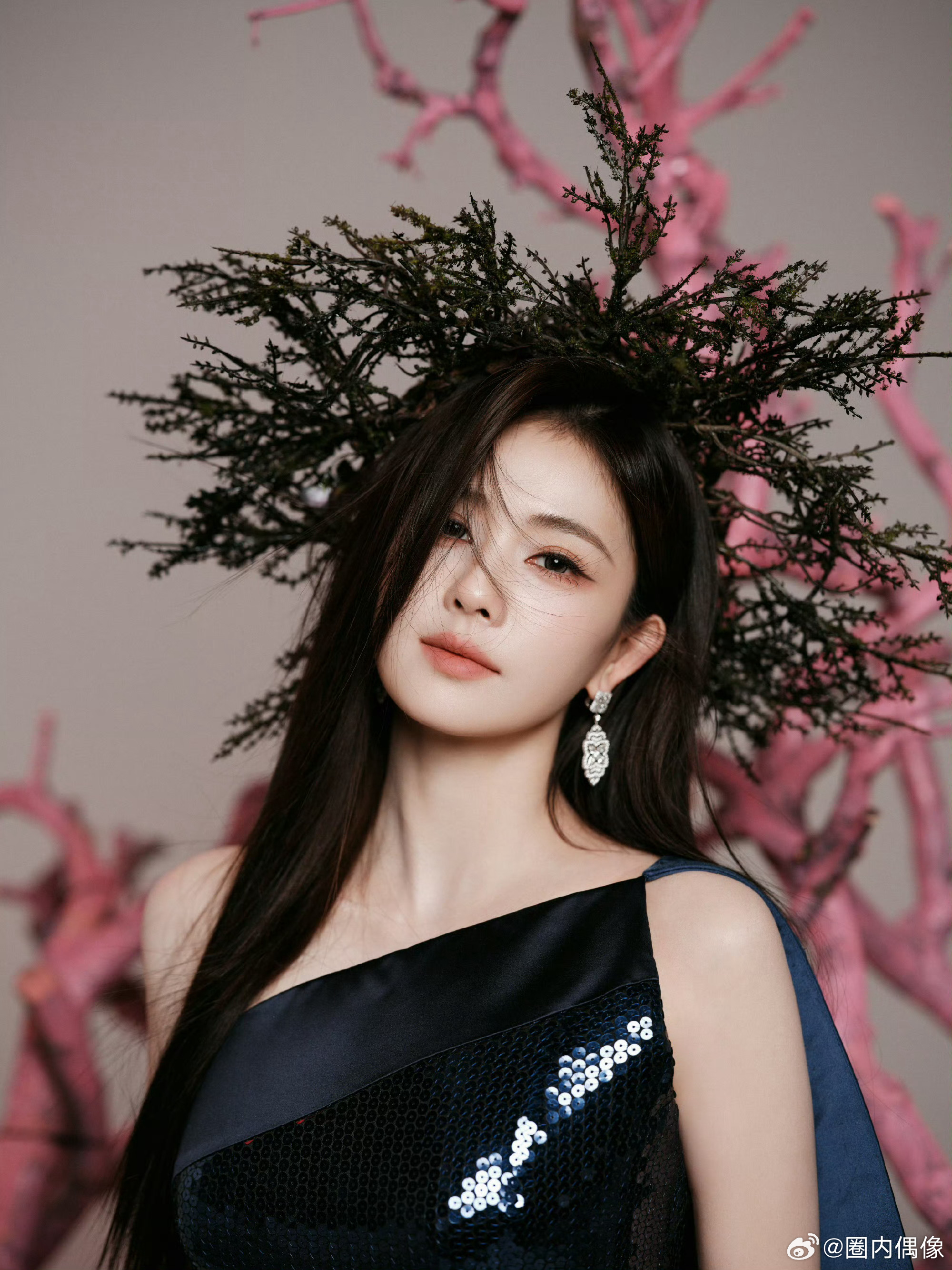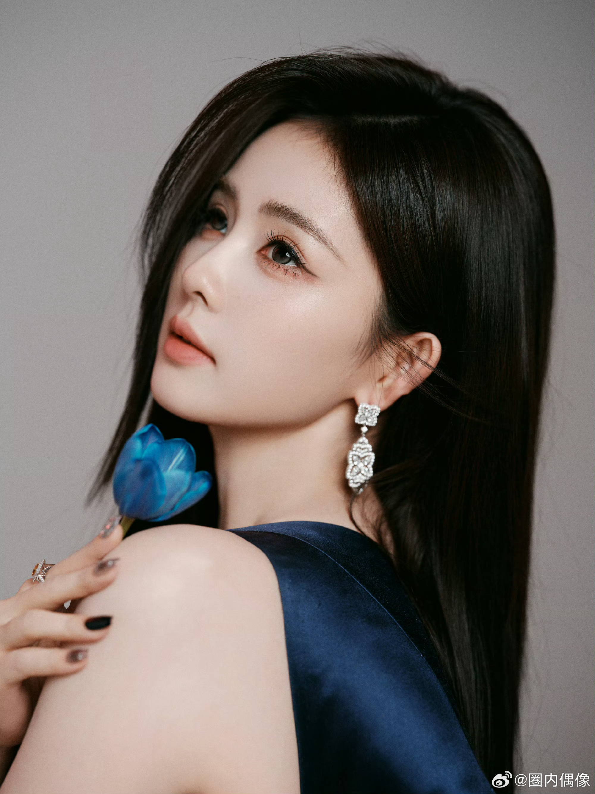 白鹿品质盛典造型图白鹿躺在鹅卵石上白鹿品质盛典造型图,身着深蓝亮片高定礼裙亮相,手持蓝色郁金香氛围感拉满!