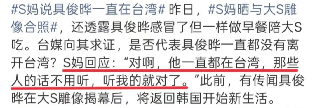 S妈看望大S,证实具俊晔一直在台湾守着女儿。 3月8日妇女节,S妈一个人开车去金宝山,她说看到很多喜欢大S的粉丝去送花,感谢(儿子)具俊晔感冒了也按时做早餐陪大S吃,还说“会盯着俩孩子健康平安的成长”。 一个人离世亲朋好友都舍不得万分难过只有一个原因,那就是这个人太好了! S妈心里一定很悲痛,大S是如此鲜活、美好的人,妈妈痛失这样的女儿怎能不苦不堪言?不管再多是是非非,这句苦楚是真切的。 早前媒体发消息称具俊晔已回到韩国陪伴老母亲。但S妈透露雕像完工后,具俊晔依然每天都会去看大S,汪小菲恨不得全世界都知道自己的爱妻人设,但具俊晔就默默站在那里陪伴着他的爱人大S。 想想还挺感慨的,熙媛已经不在了,可这份藏在细节里的惦记,还有那些一起走过的日子,都是真的。愿天堂没有那么多苦难,熙媛能好好歇着,来世能简简单单、平平安安地幸福下去!